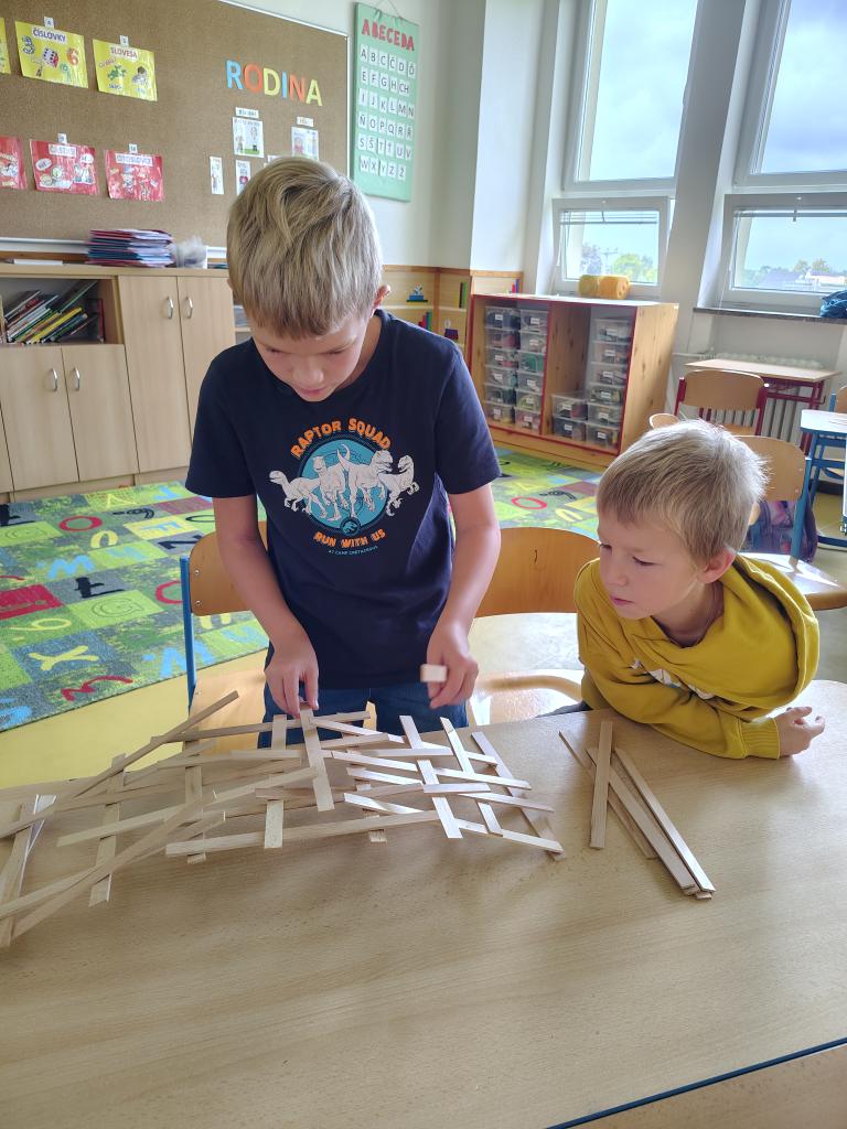 V pracovní výchově jsme z dřívek stavěli da Vinciho mosty, bez spojovacích materiálů udrží most i těžší břemeno. Každý zkoušel stavět sám a nakonec stavěly týmy stavby dle své fantazie.