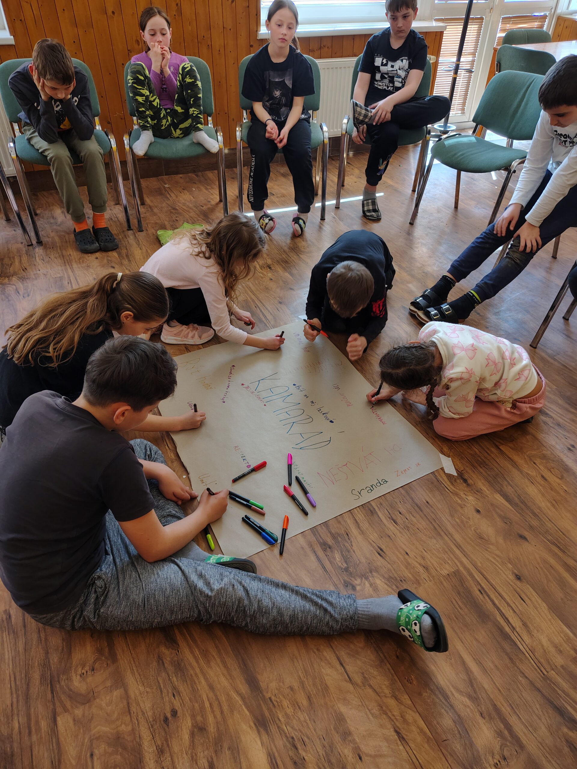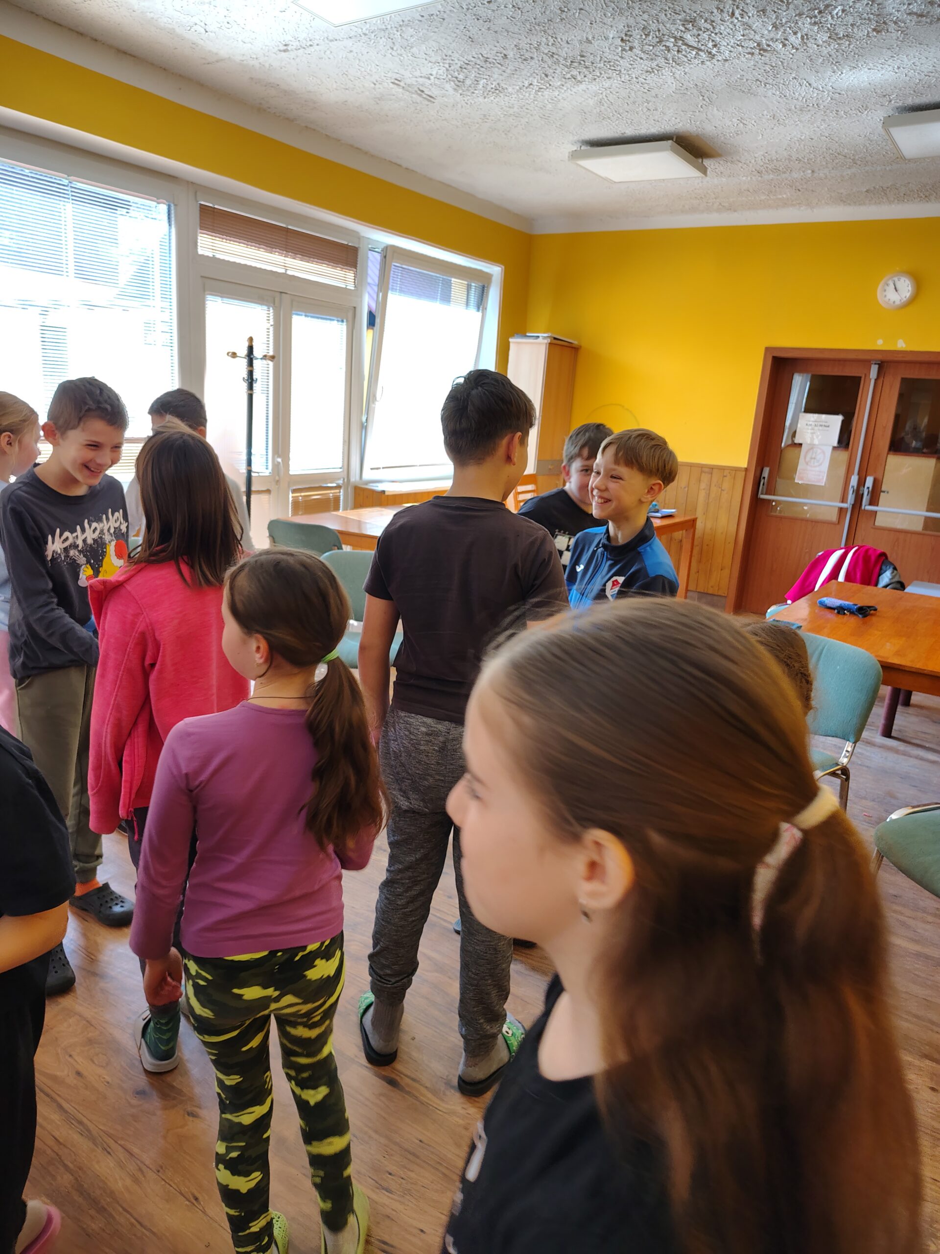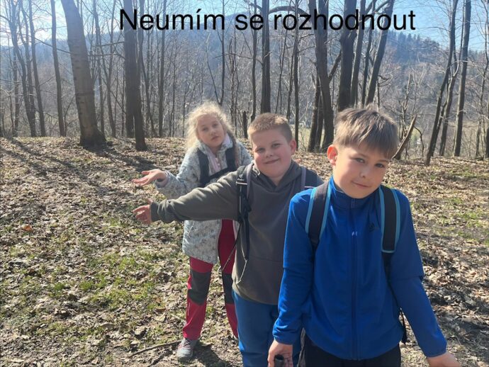 Je za námi neděle a s ní i spousta aktivit. Ráno jsme zahájili pyžamově, snídaně v pyžamu nám chutnala, pak jsme shlédli film a vyrazili ven. Nejprve jsme se snažili ve skupinkách rozvázat gordický uzel, pak jsme v rámci olympijského desetiboje uzly zase zavazovali. Uvázat 3 uzly do minuty zvládli nejlépe Magda, Anežka, Júlča a Judit. Ve trojicích jsme pak trénovali spolupráci a přenášení fixů. Před obědem jsme lehce šplhali do kopce, abychom se z výšky rozhlédli. A den jsme zakončili večerní stezkou odvahy.