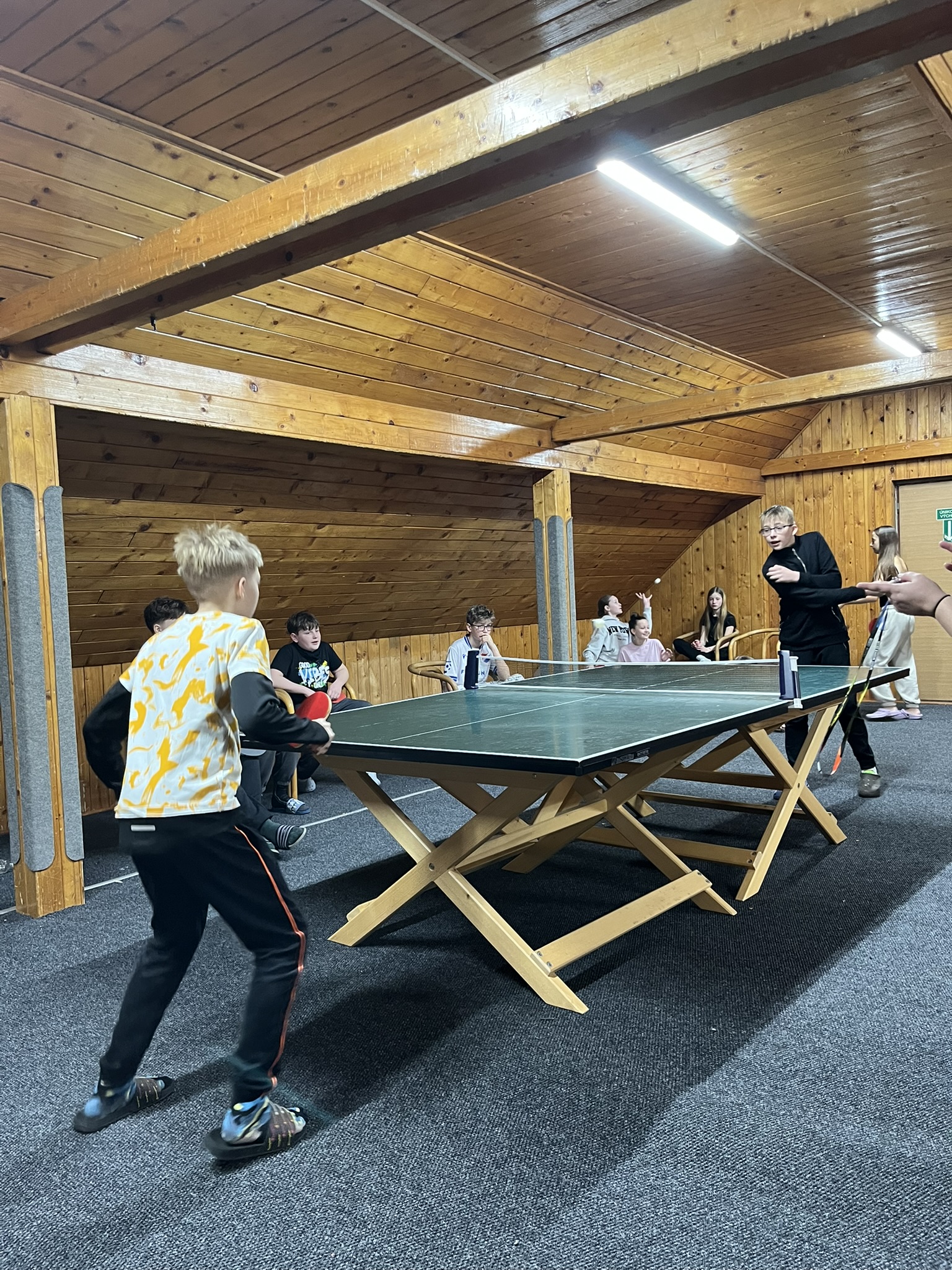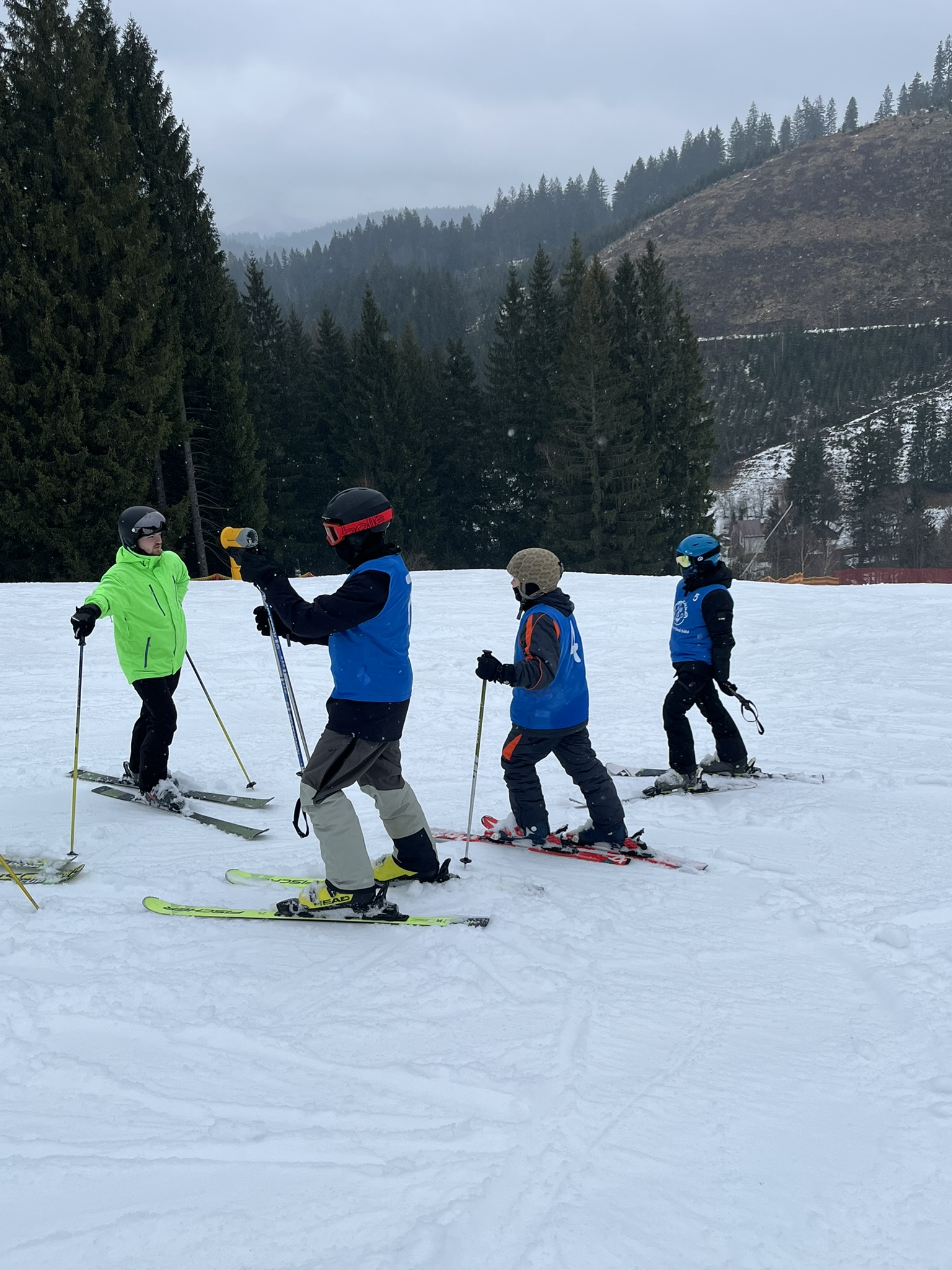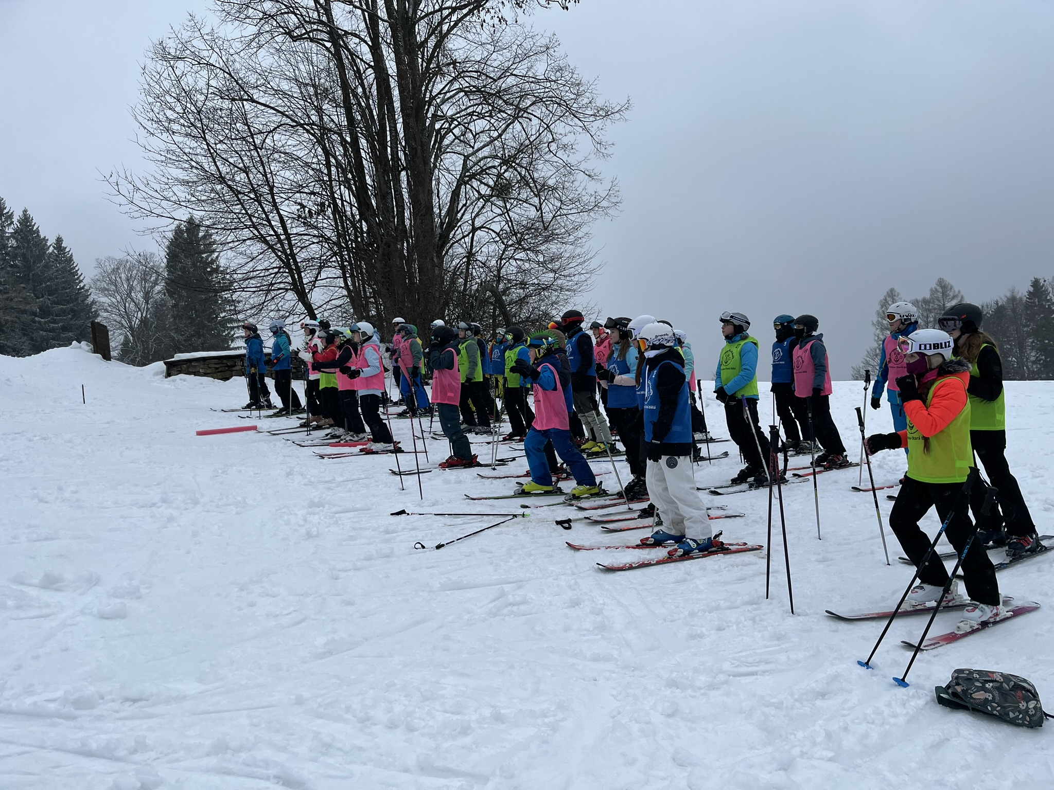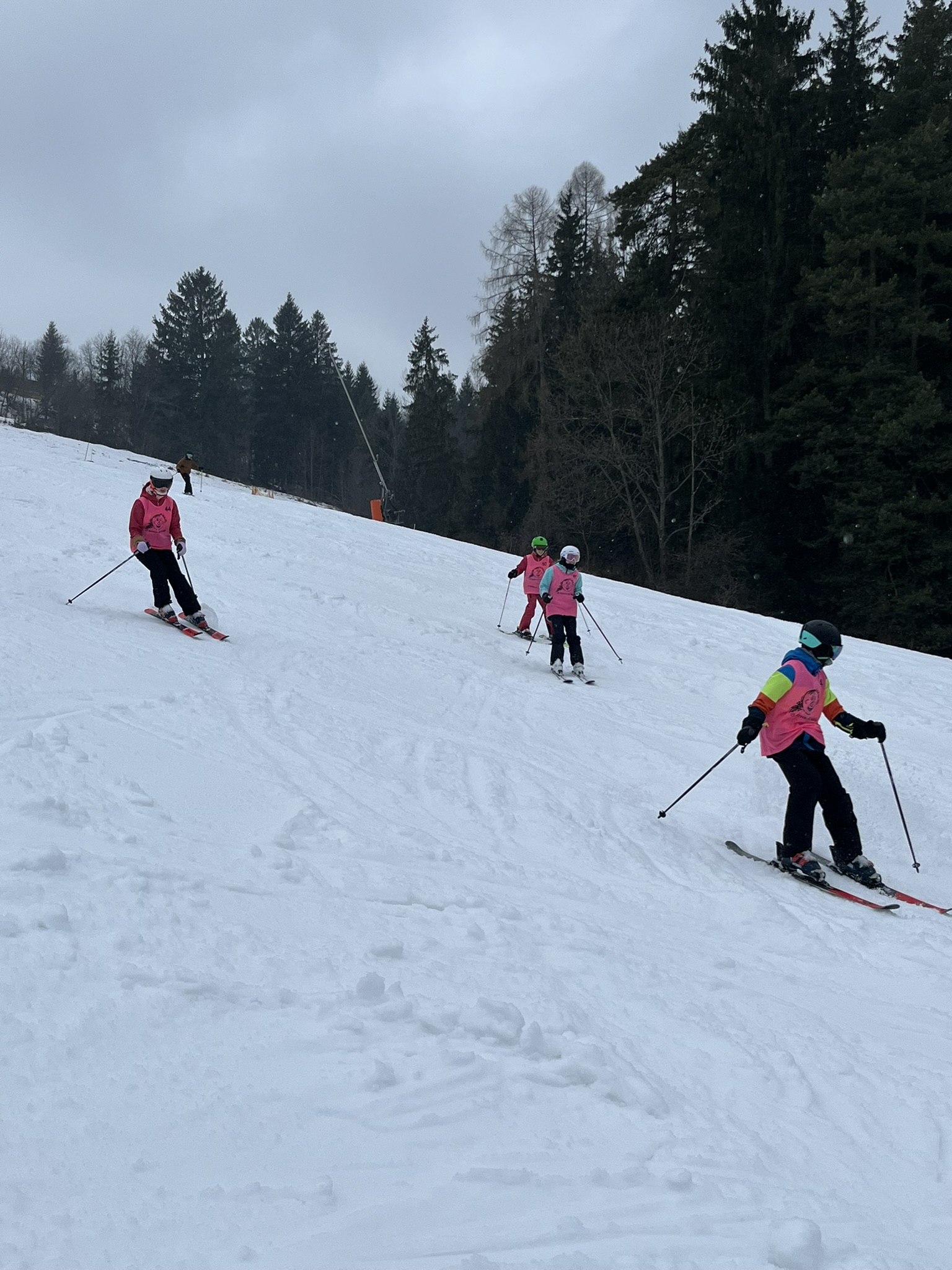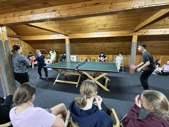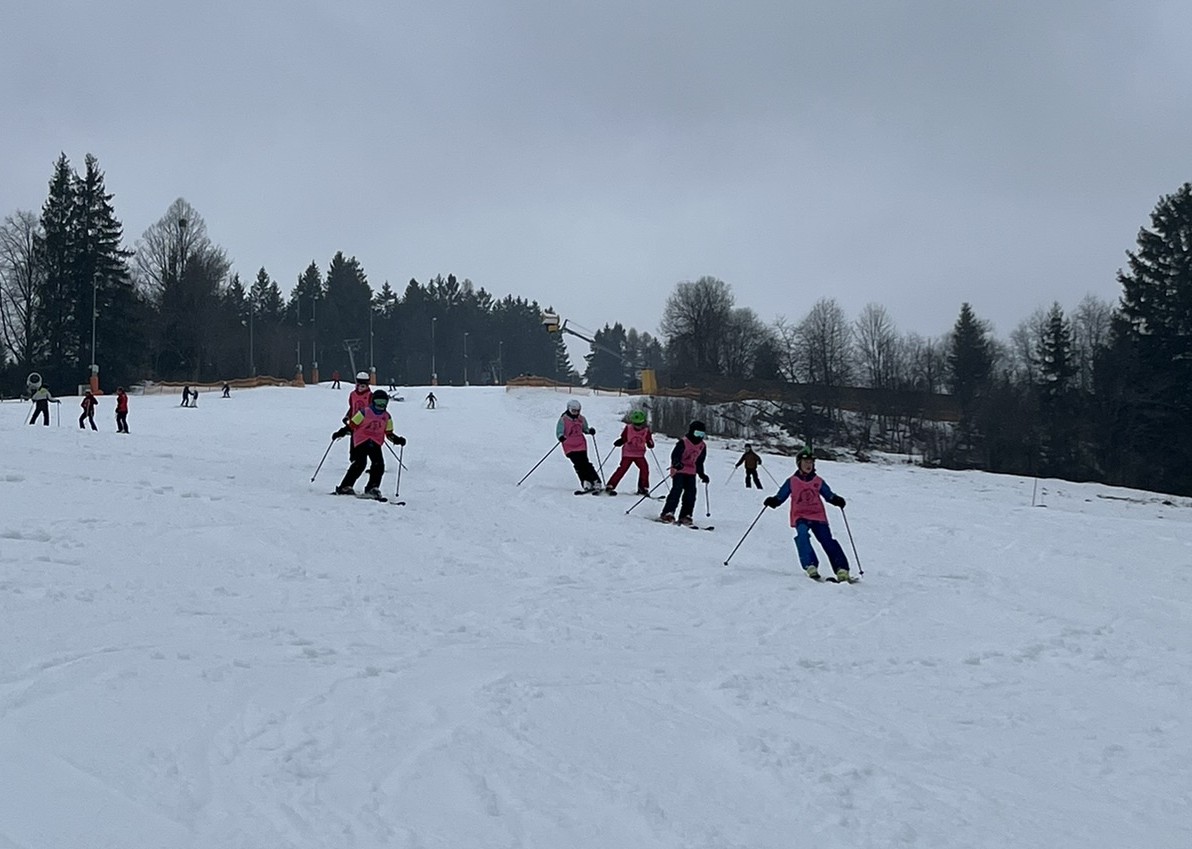 Zdravíme z Kyčerky! Dnešní den byl oblačný – sněžilo a hory ukázaly svou zimní tvář. Děti udělaly obrovské pokroky, především naši začínající lyžaři, kteří už všichni zvládli jízdu na velkém kopci na kotvě a sjeli ho plynule a s úsměvem. Postupně jsme také zahájili přípravy na zítřejší závody, na které se všichni moc těší. Odpoledne jsme si zpestřili turnajem ve stolním tenise – účast byla opravdu hojná a výkony překvapivě vysoké. Všichni jsou v pořádku a v dobré náladě.