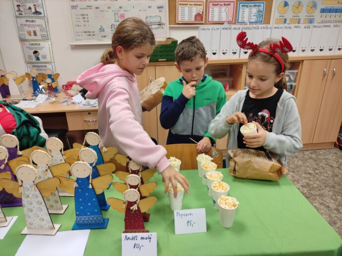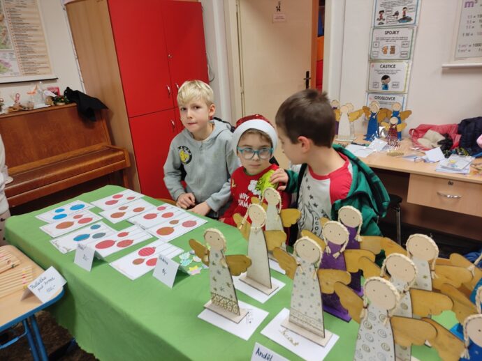 V rámci vánočních dílen jsme vyráběli anděly a přání a pak jsme se v úterý mohli účastnit generální zkoušky školního sboru a také si vyslechnout představení dětí z mateřských školek. Byl to moc pěkný koncert. Odpoledne pak propukl tradiční vánoční jarmark v plné síle. Děti prodávaly a rodiče a další návštěvníci nakupovali jak diví. Děkujeme všem, kdo jste si od nás odnesli nějakou upomínku.