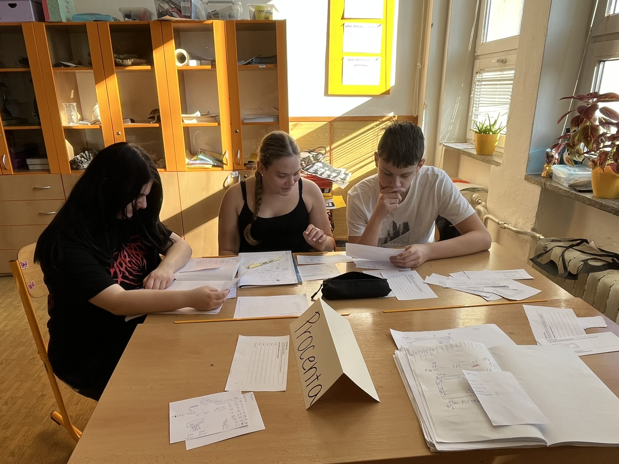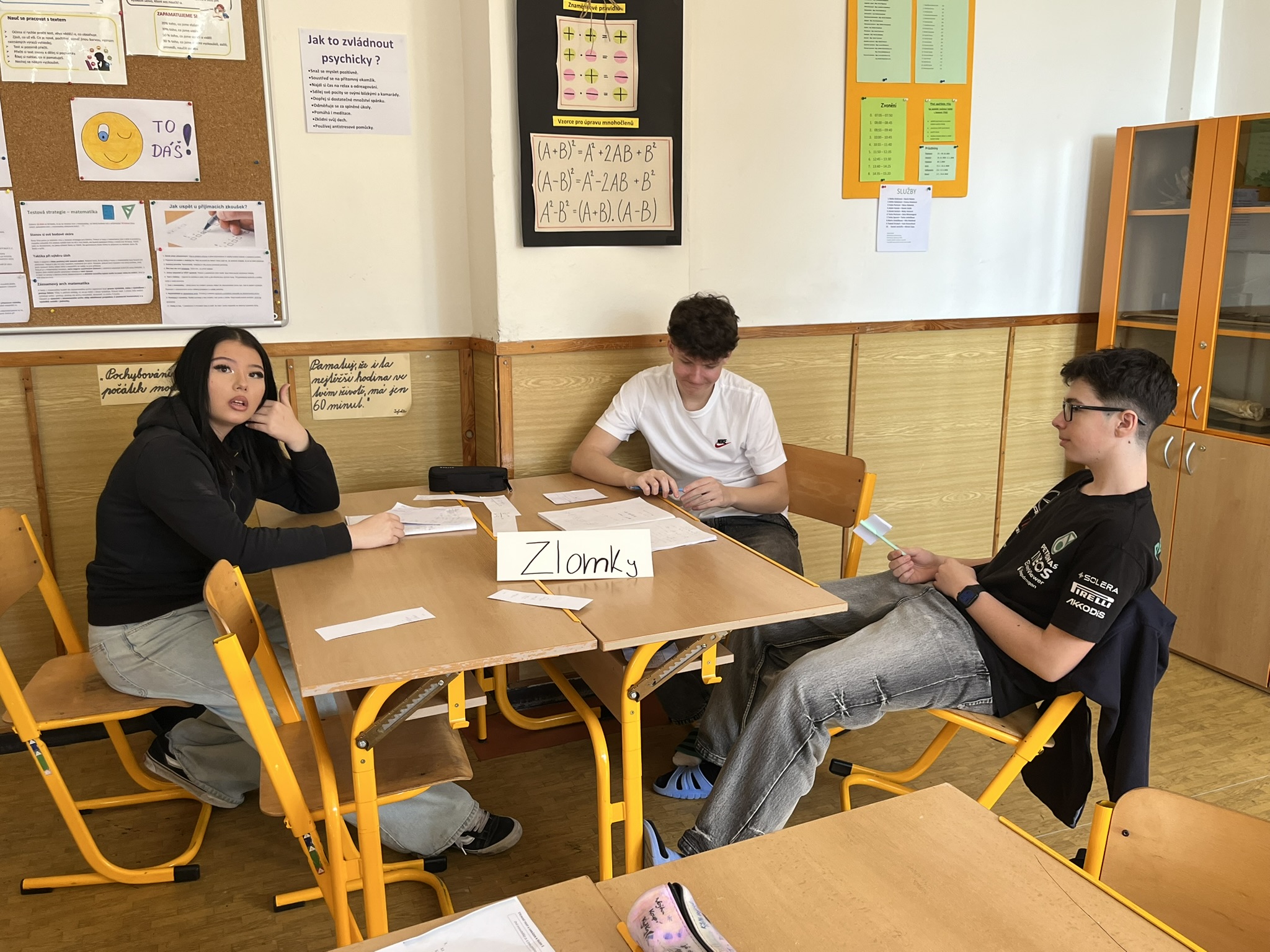 Druhou část dne jsme věnovali prevenci neúspěchu u přijímacích zkoušek. Několik žáků si připravilo úlohy z různých tematických okruhů, ve kterých se cítí silní, a stali se tak na jednotlivých stanovištích „experty“. Ostatní spolužáci postupně procházeli stanoviště a řešili připravené příklady. „Experti“ jim poskytovali pomoc a vysvětlení.