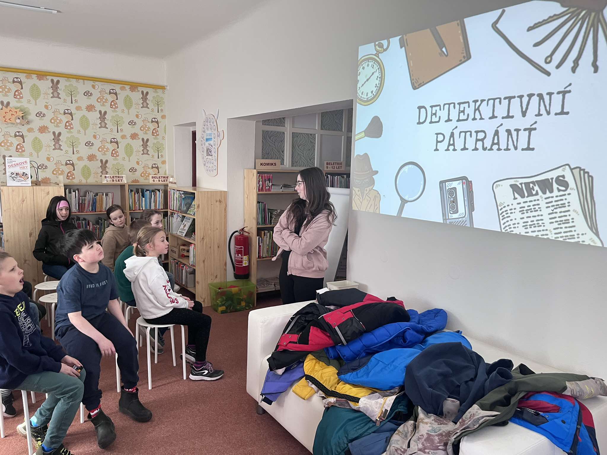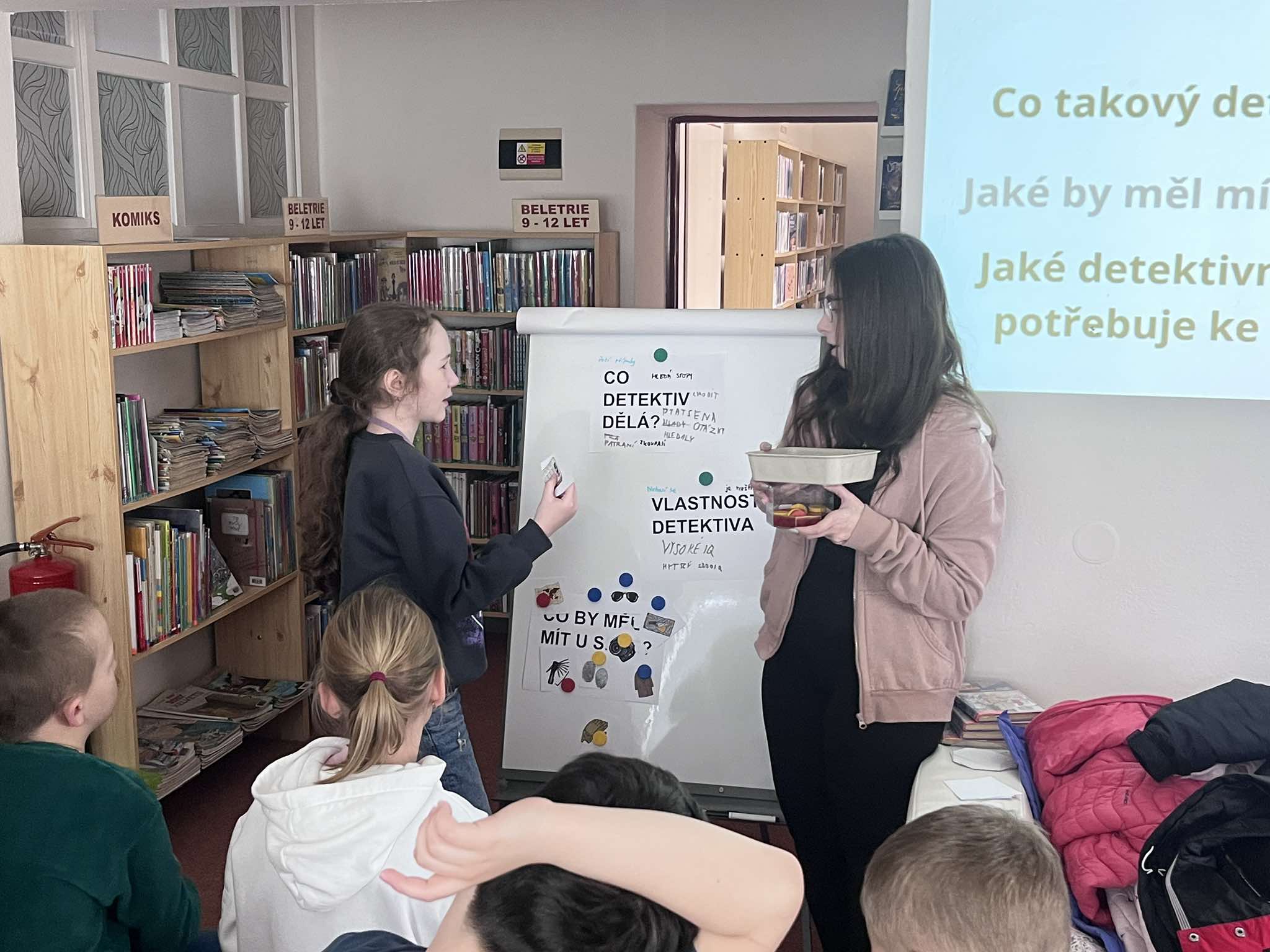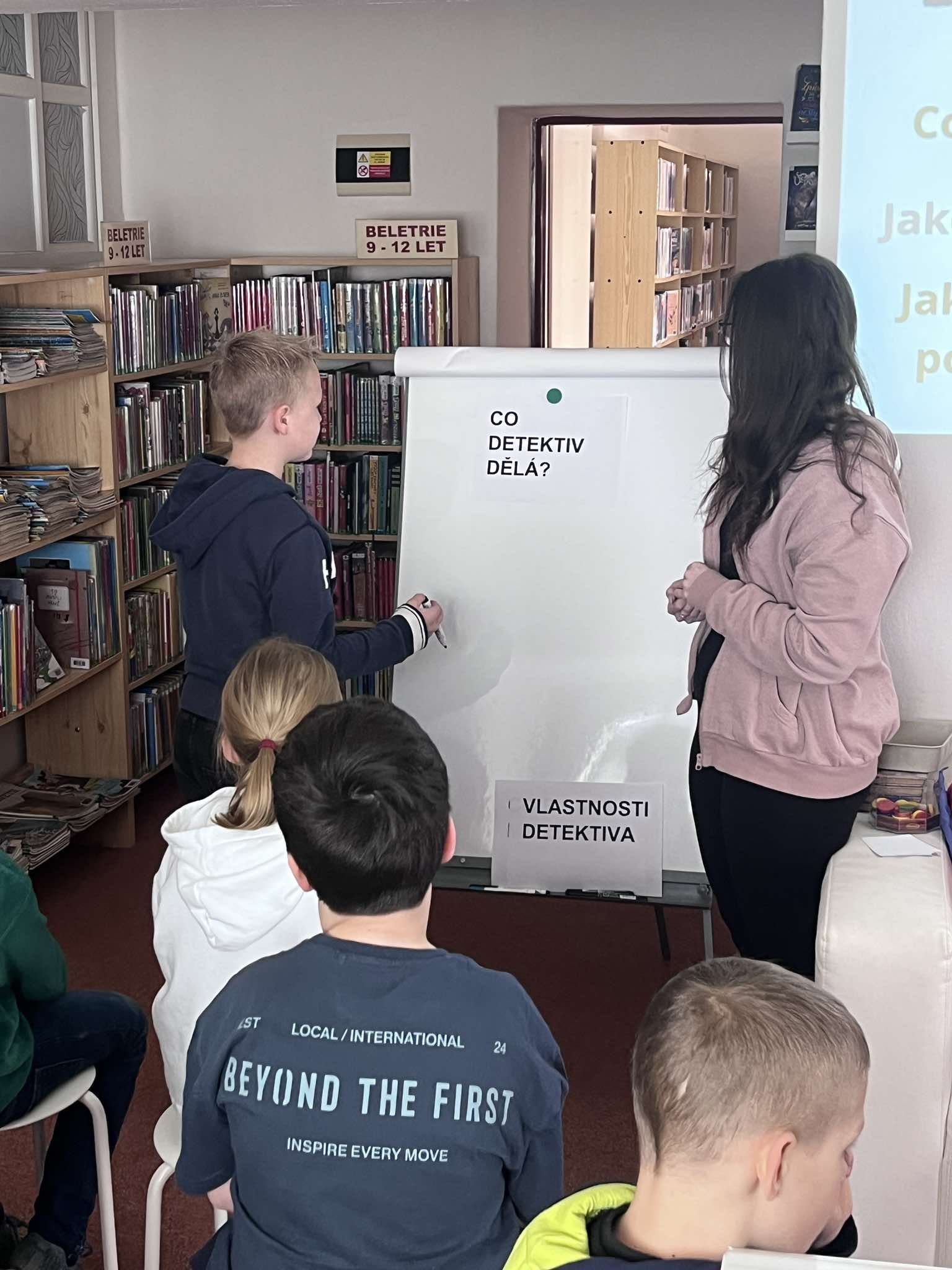 Dnes jsme v knihovně byli na pěkné besedě s názvem Detektivní pátrání. Seznámili jsme se s tímto žánrem a vyřešili jsme detektivní záhadu.