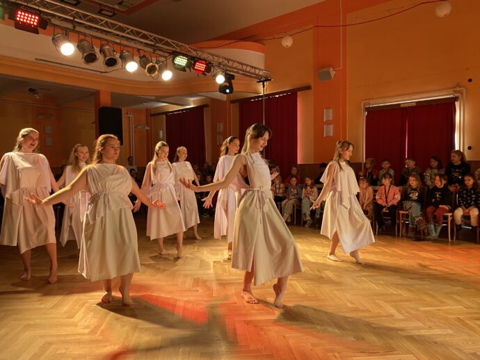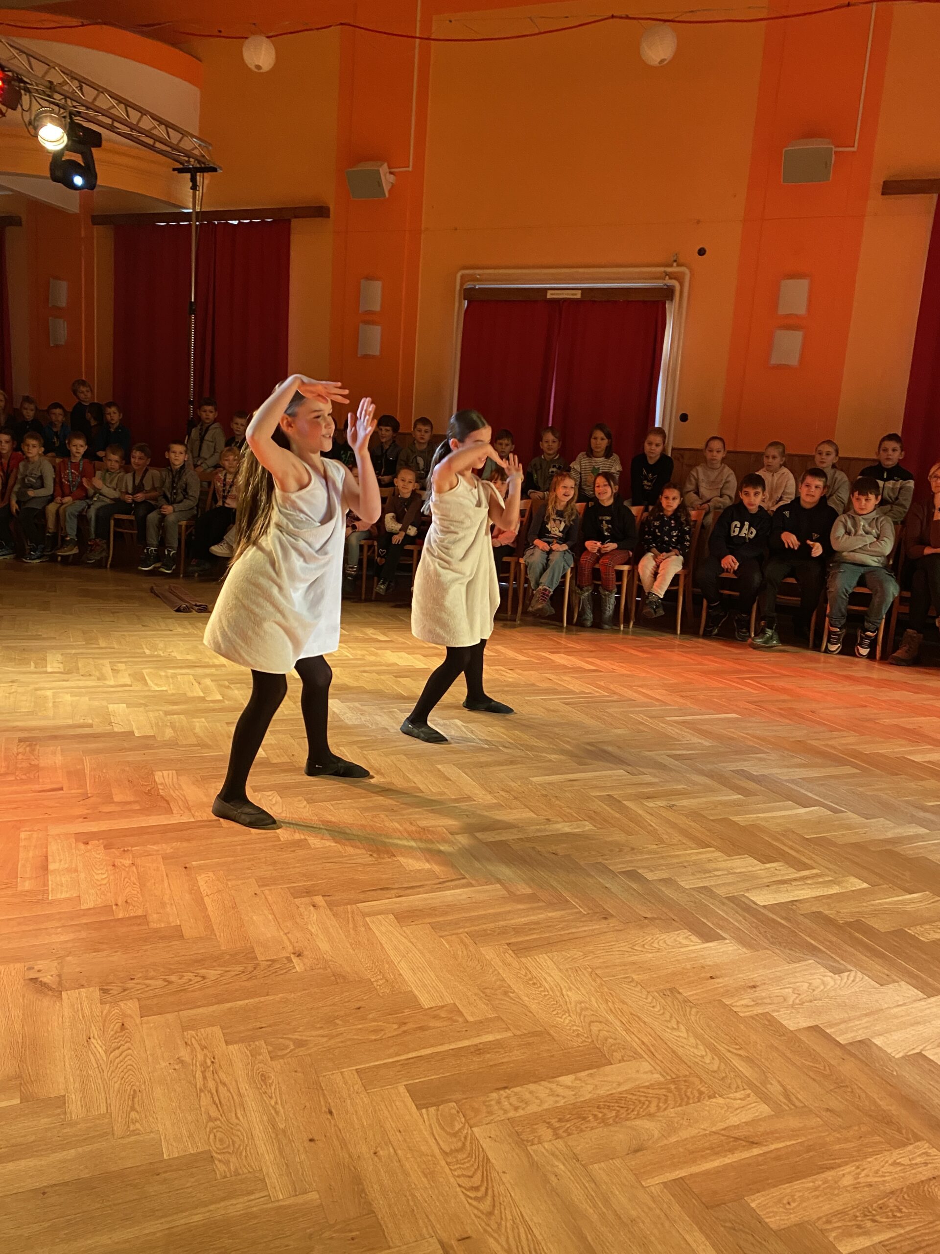 Krásná hudba, zajímavé taneční kostýmy i nádherné šaty, nápaditá choreografie, to vše bylo k vidění na dnešním dopoledním vánočním galapředstavení. Některá děvčátka z naší třídy shlédnutá čísla lákala k vlastním tanečním kreacím.