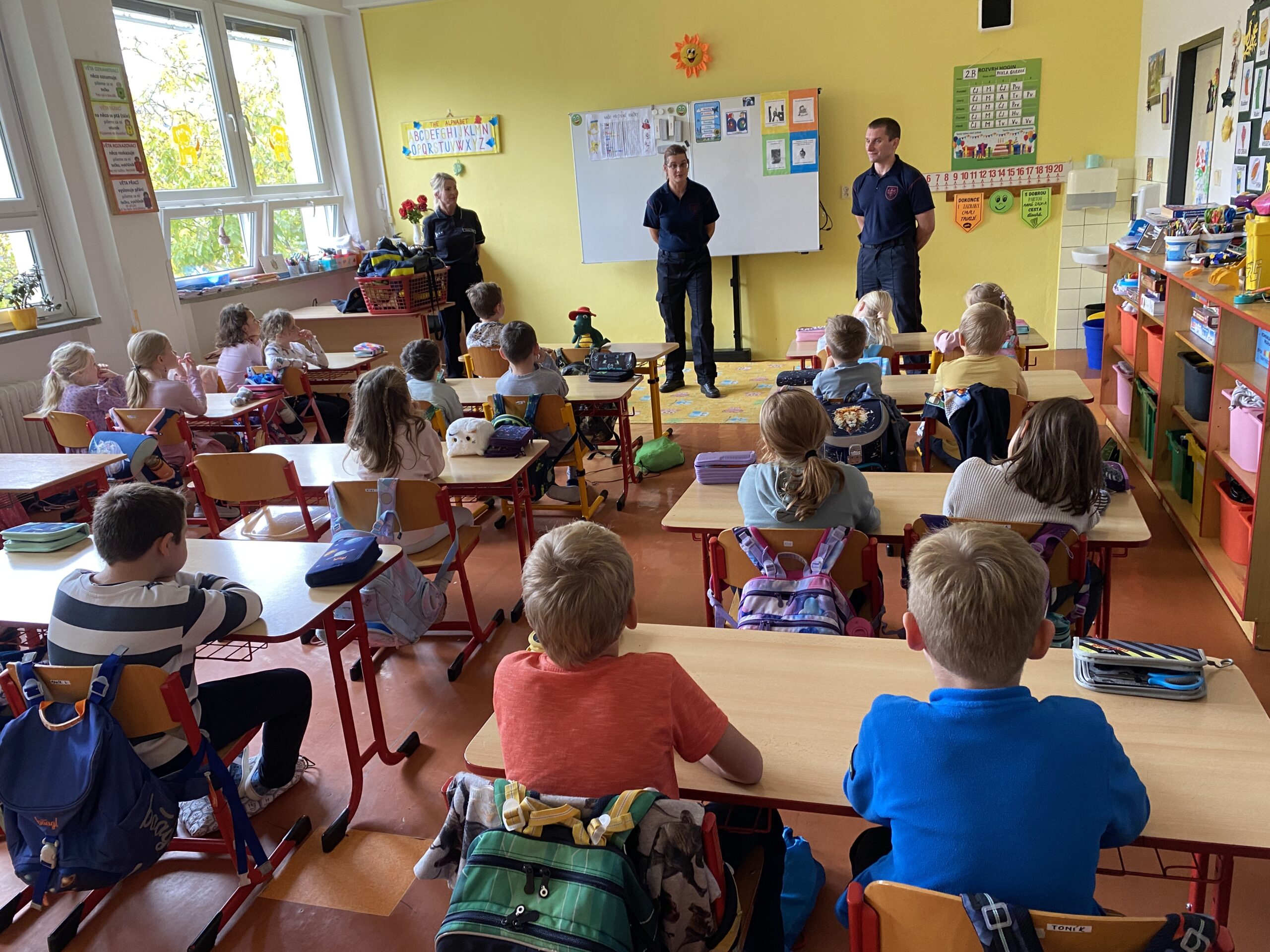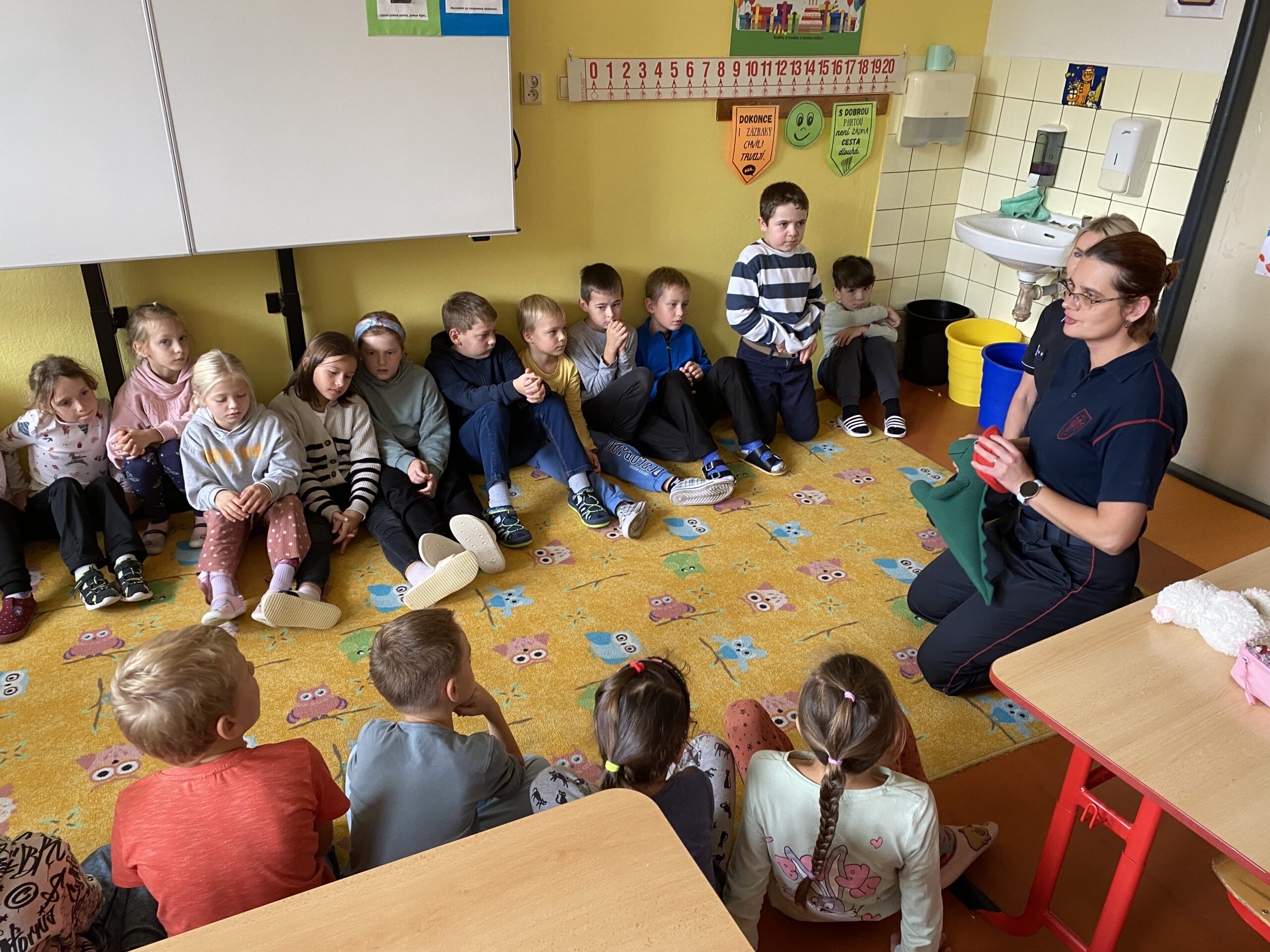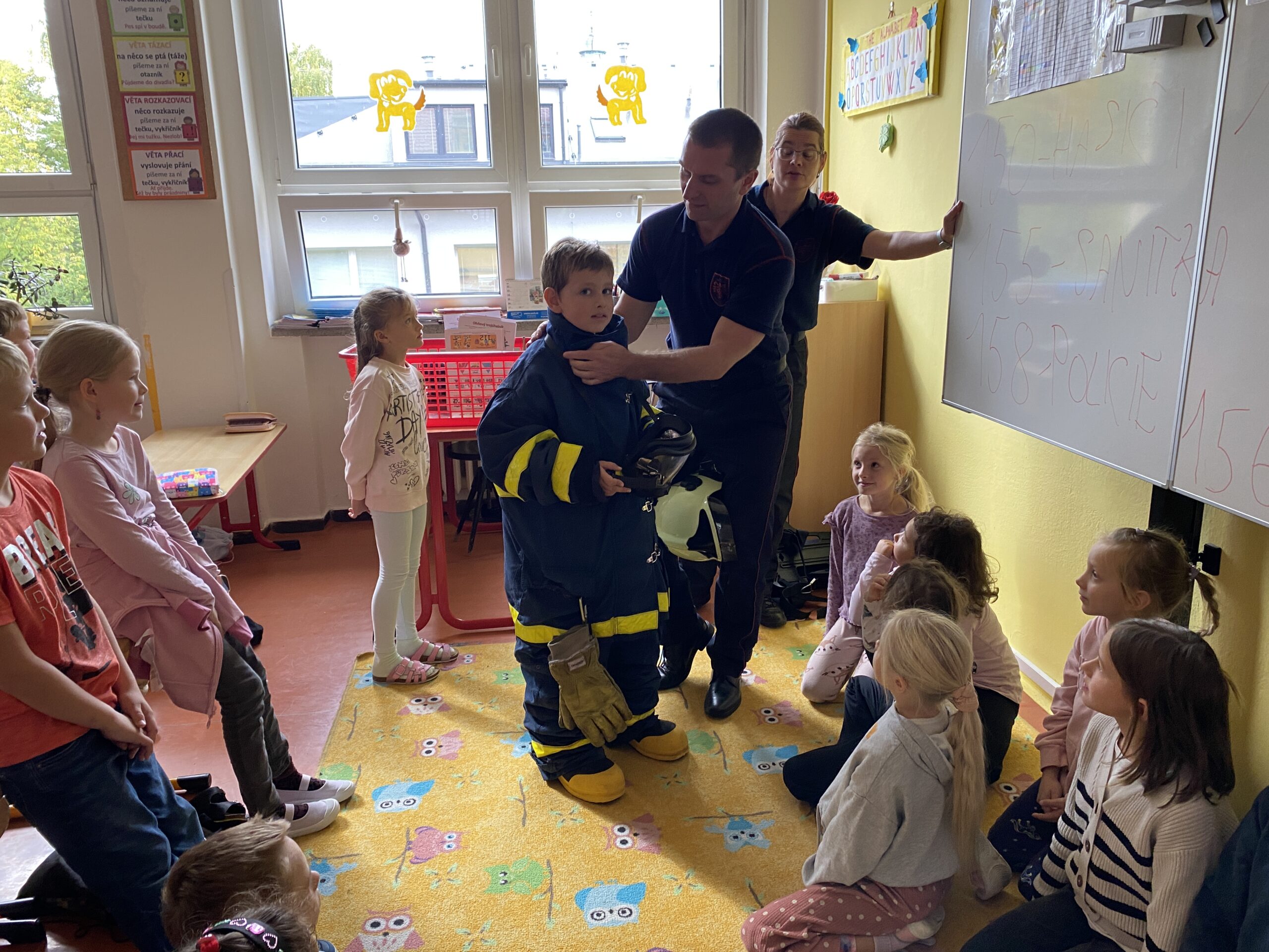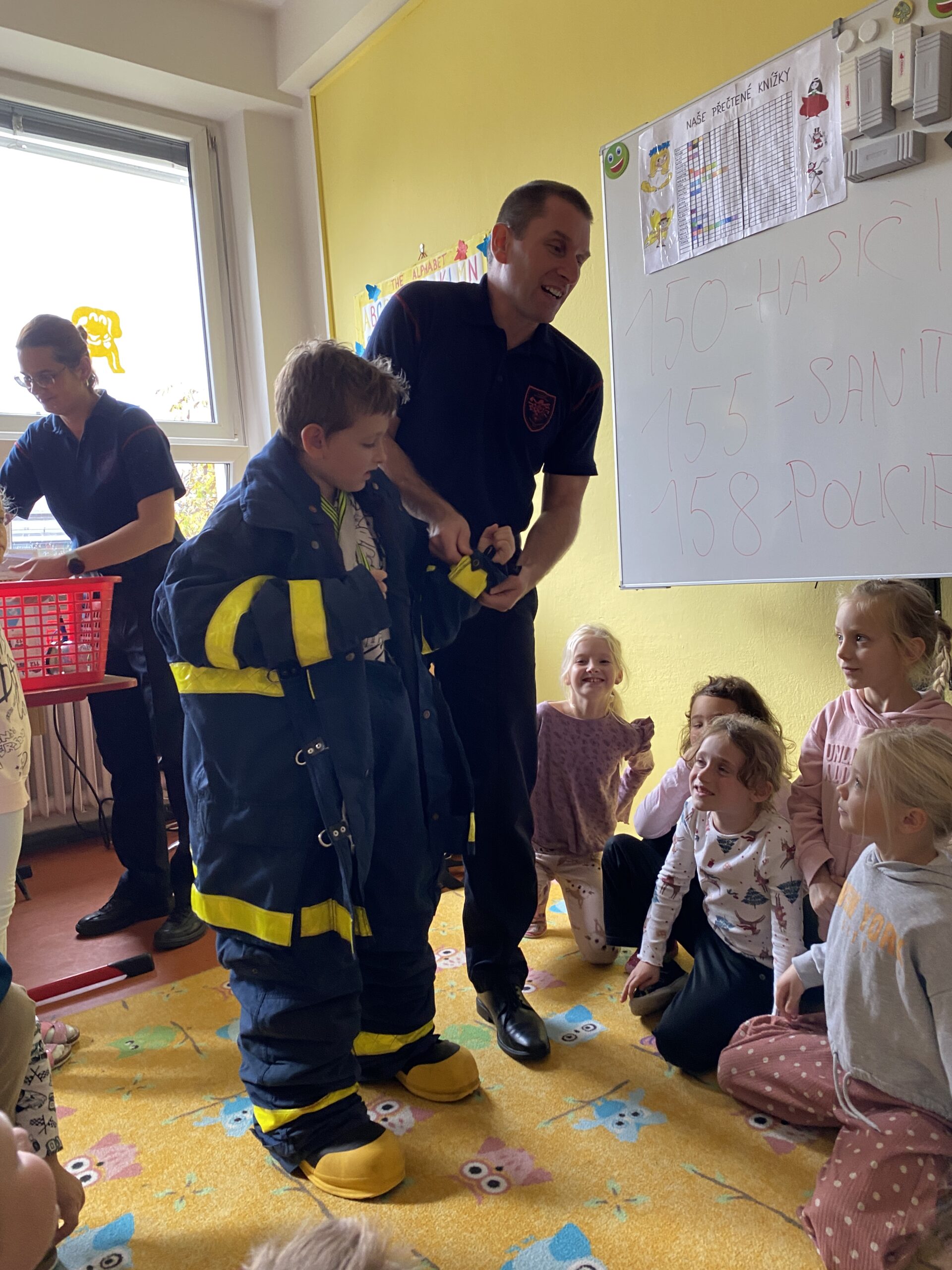 Povídání o práci hasičů. Zopakování důležitých telefonních čísel a jak telefonovat na centrálu, když je nutná pomoc hasičského záchranného sboru.