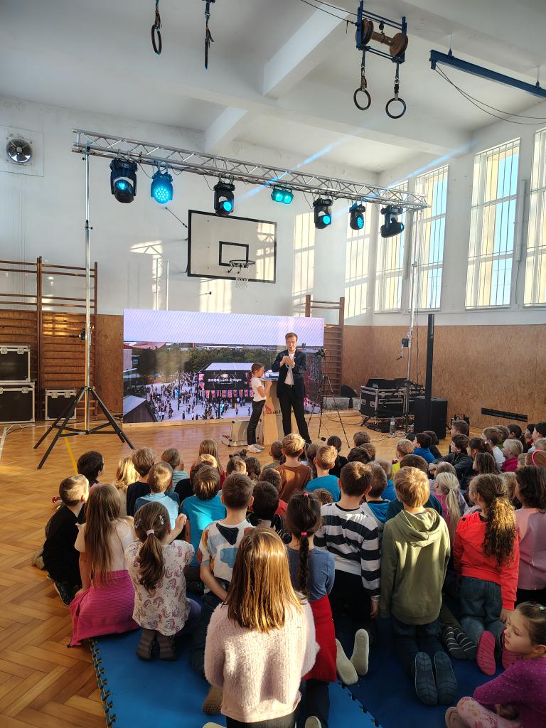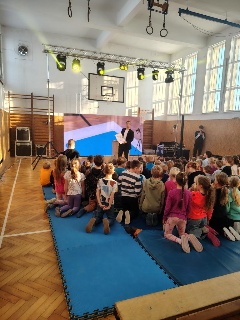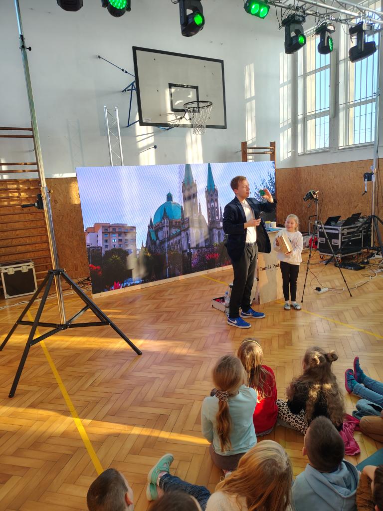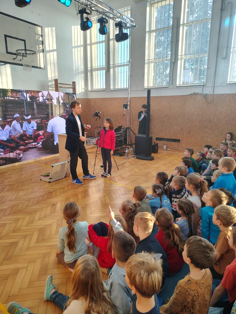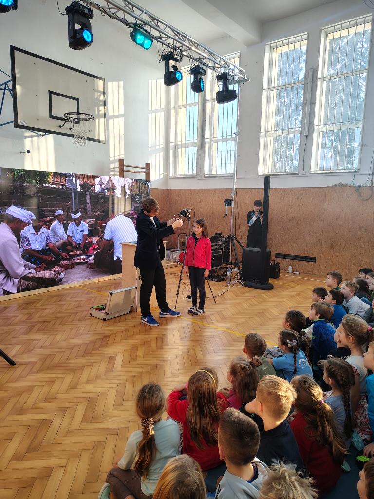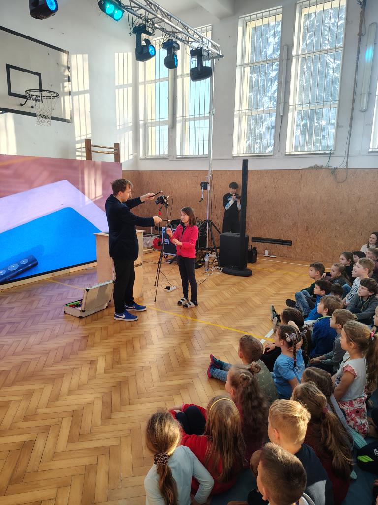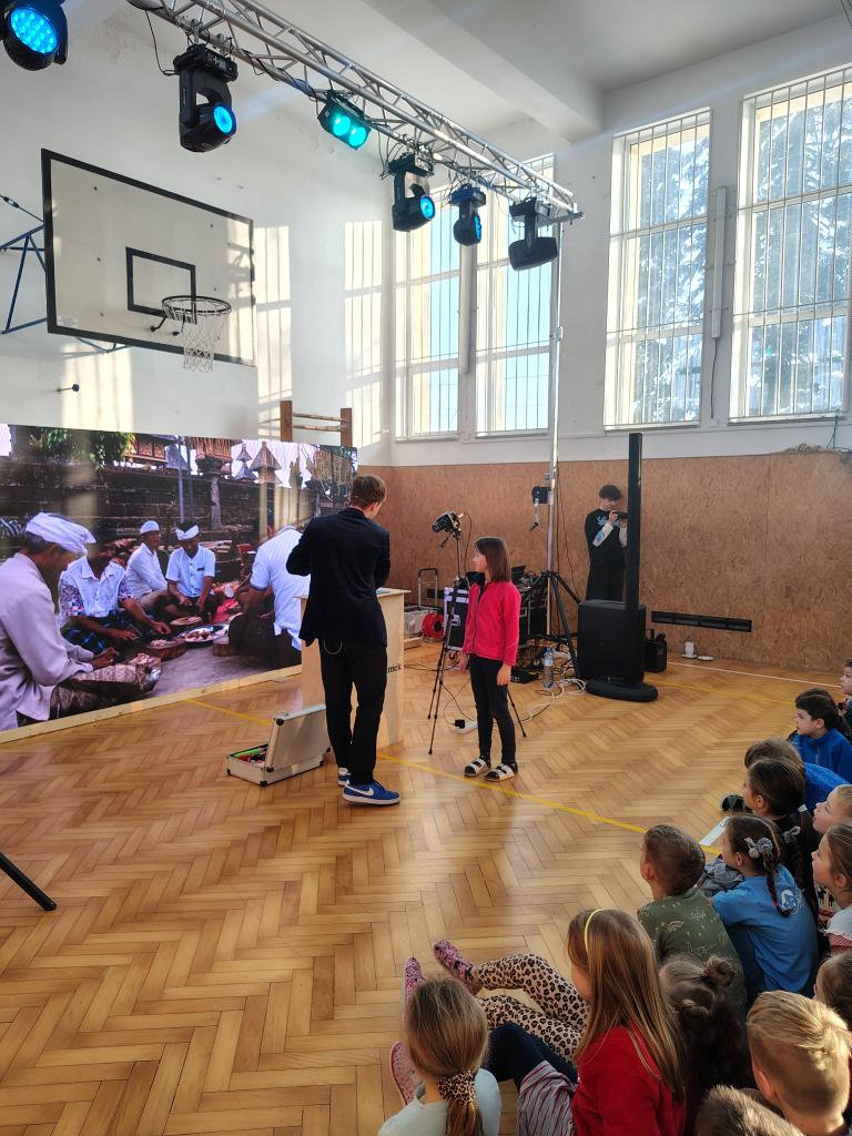 V tělocvičně školy proběhlo vystoupení kouzelníka Tomáše Podzimka, který procestoval skoro celý svět. A kromě cestopisného vyprávění, předvedl několik originálních kouzel. Některým dětem se podařilo být na chvíli asistenty kouzelníka.