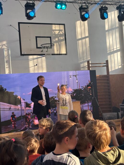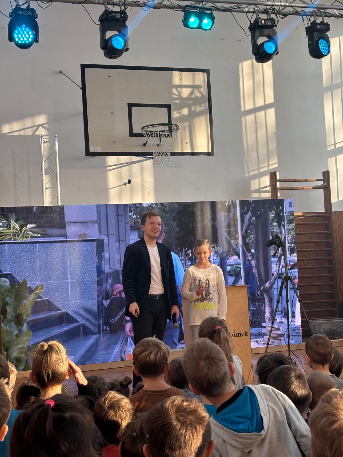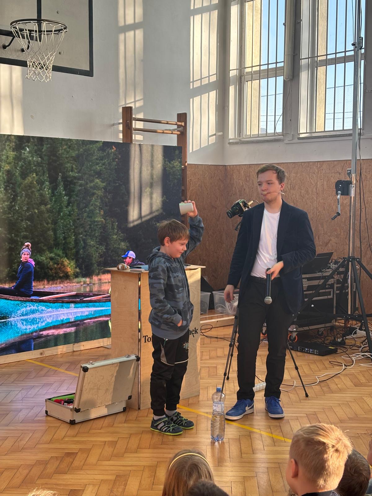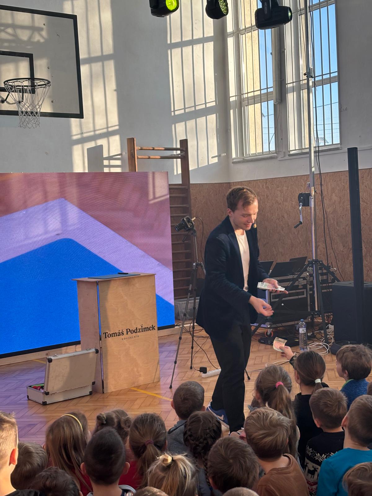Dnes jsme zhlédli představení talentovaného mladého kouzelníka Tomáše Podzimka, který nás provedl po všech kontinentech a ukázal nám svá kouzla. Představení bylo okořeněno vtipem a nám všem se moc líbilo.