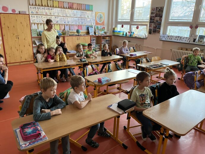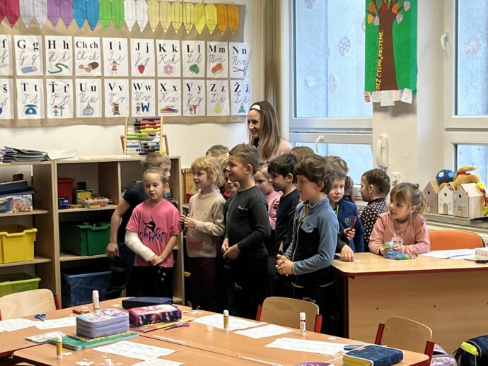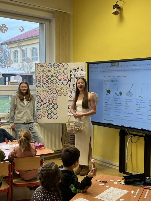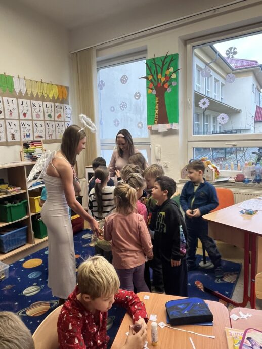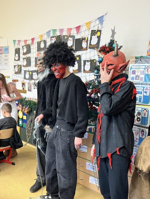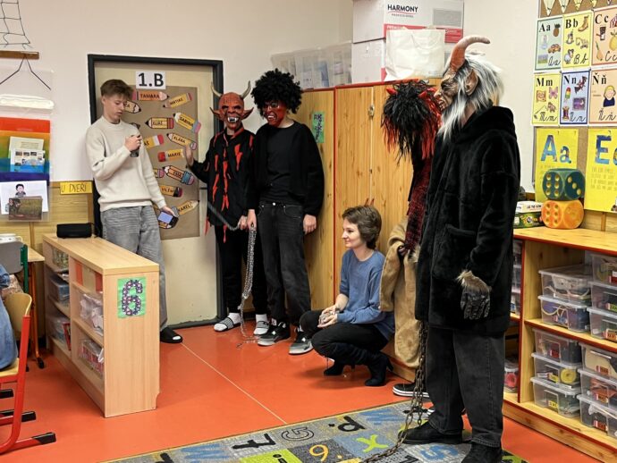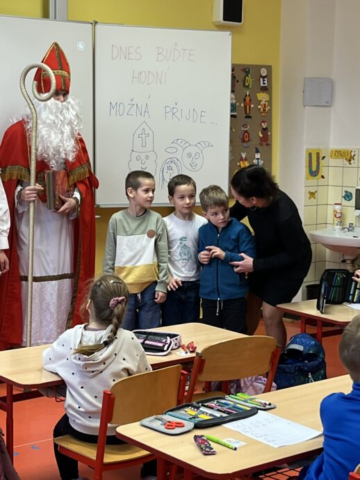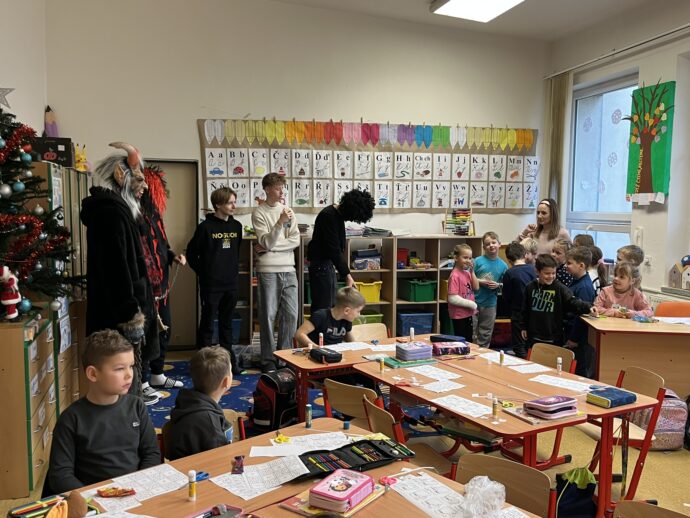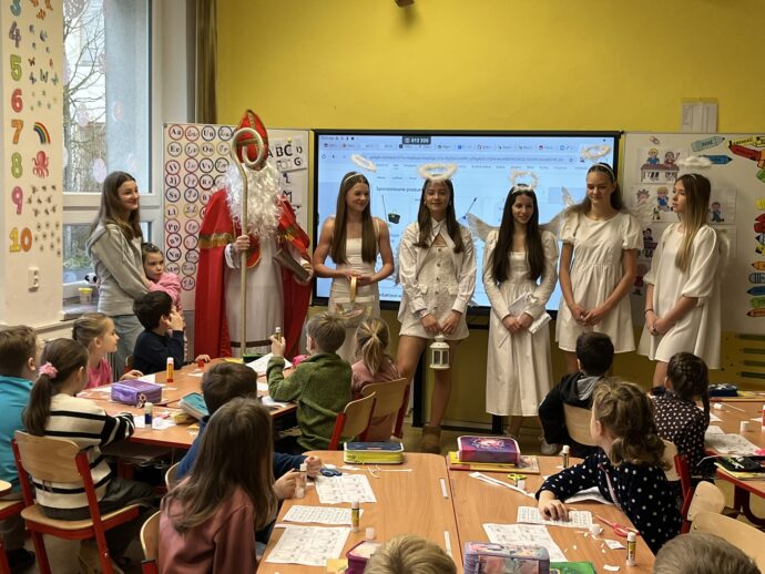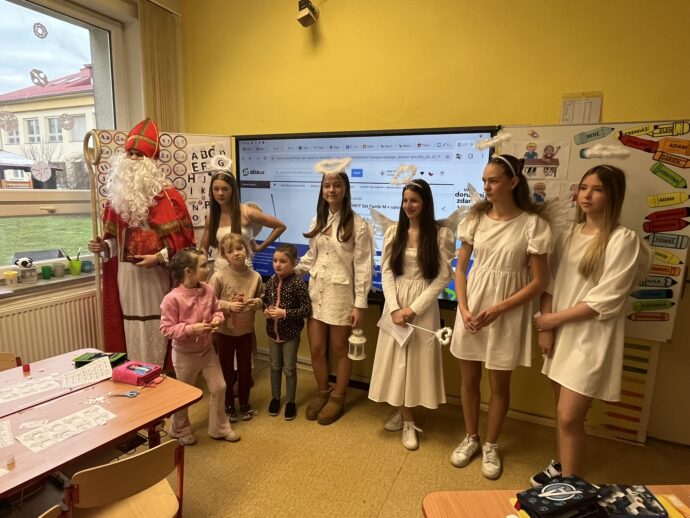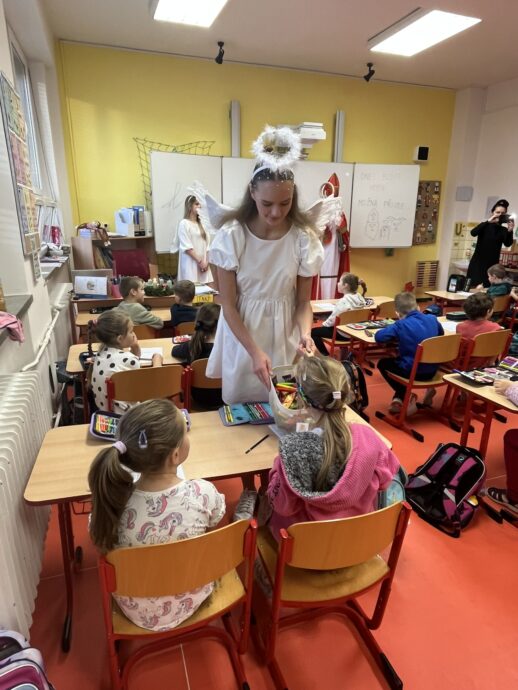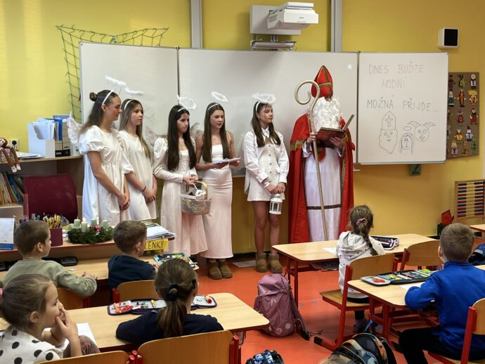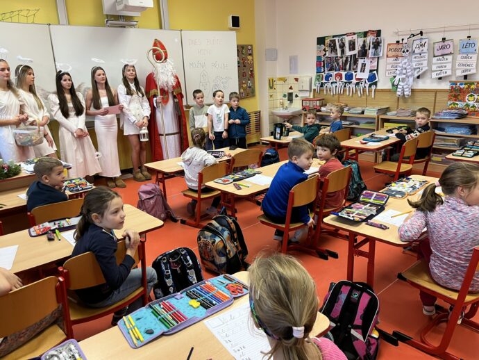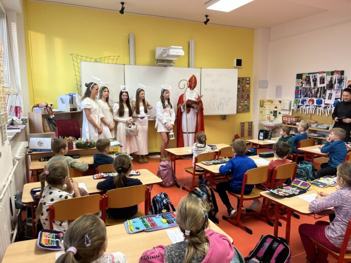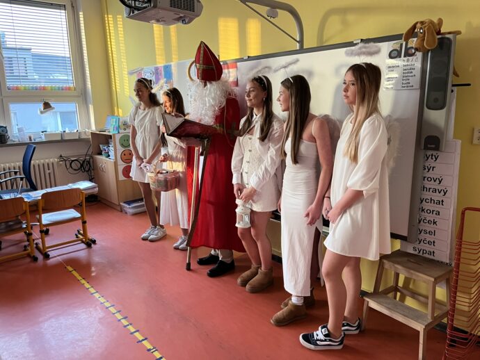 Žáci devátých tříd si v naší škole připravili tradiční mikulášskou nadílku pro své malé kamarády z prvních tříd. Převlékli se do kostýmů Mikuláše, andělů a čertů a s nadílkou se vydali přímo do tříd prvňáčků.