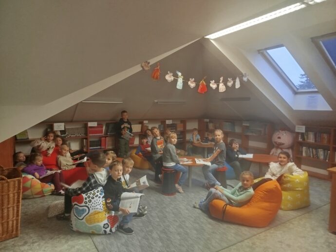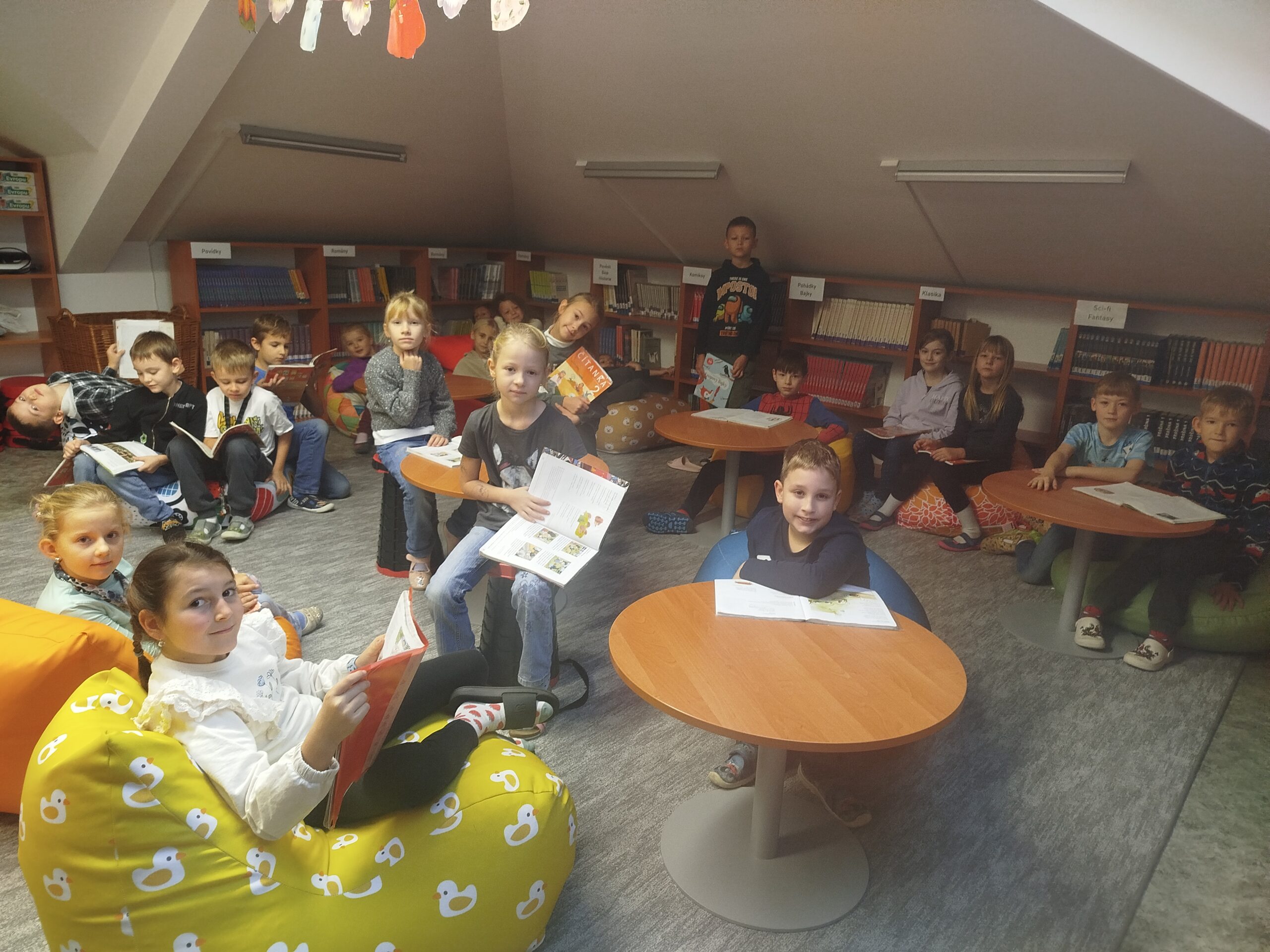 Dnešní ráno jsme si zpříjemnili čtením v knihovně 2. stupně, kde to máme moc rádi.