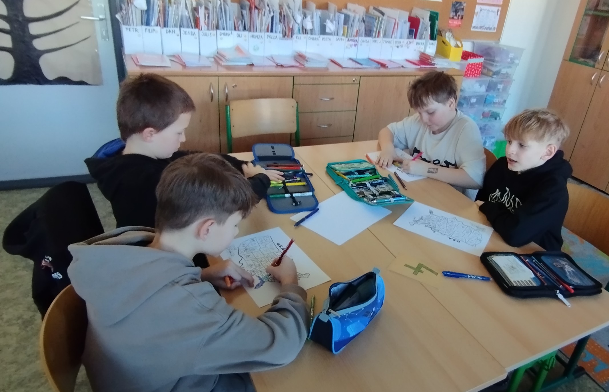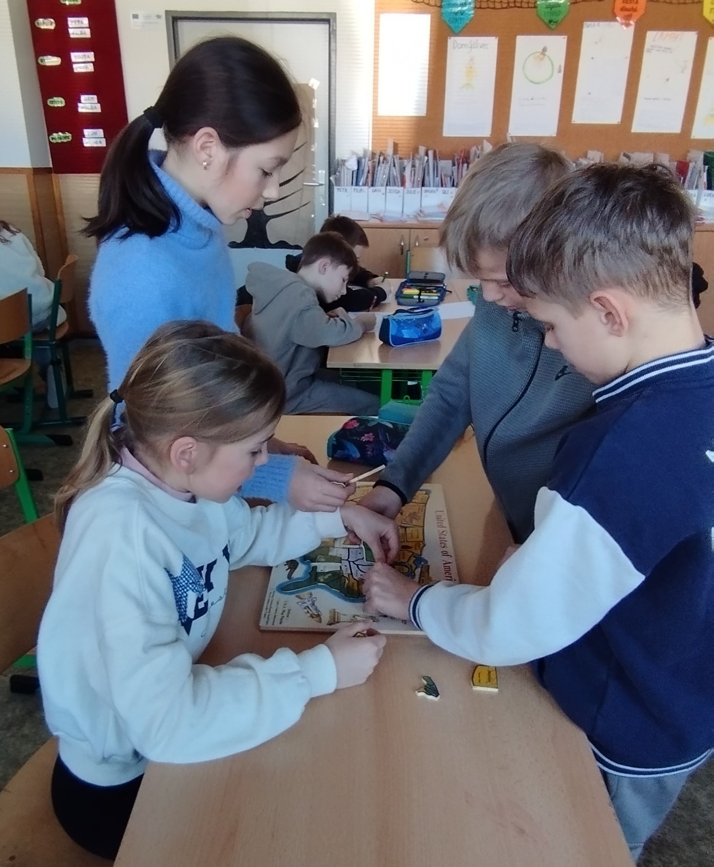 Následně jsme se v zabývali reáliemi USA – ve skupinkách jsme si na školních tabletech vyhledávali informace či doplňovali pracovní listy, správně složili puzzle 50 států USA, seznámili se s vlajkou, symboly.
