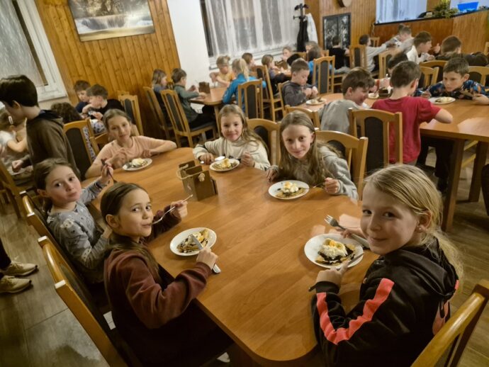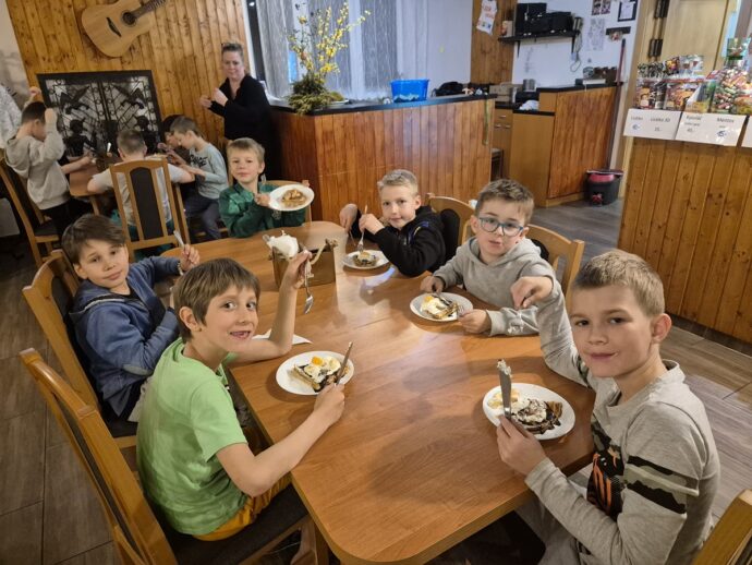 Poslední den nám nasněžilo mokrým sněhem, takže veškerý program byl na chatě. Nejdříve jsme hráli hru „Uhádni, kdo jsi“, pak jsme zhodnotili celý pobyt a aktivity a dočetli knihu Městečko. Následovala hra „Městečko Palermo“, odpoledne bowling a pátrací hra. Večer došlo na to nejočekávanější: vyhodnocení všech soutěží. Všichni si nakonec odnesli krásné ceny a třešničkou na dortu byly palačinky jako druhá večeře. Pokud vás zajímá, kolik bylo lentilek ve sklenici, tak jich tam bylo 280. Nejblíže byli se svým tipem rodiče od Nely z 3. B. 🙂