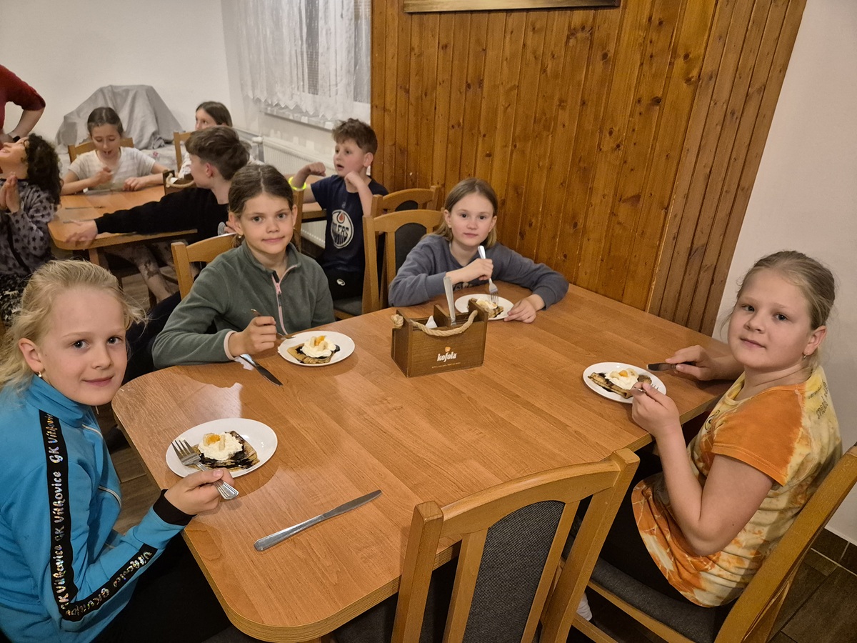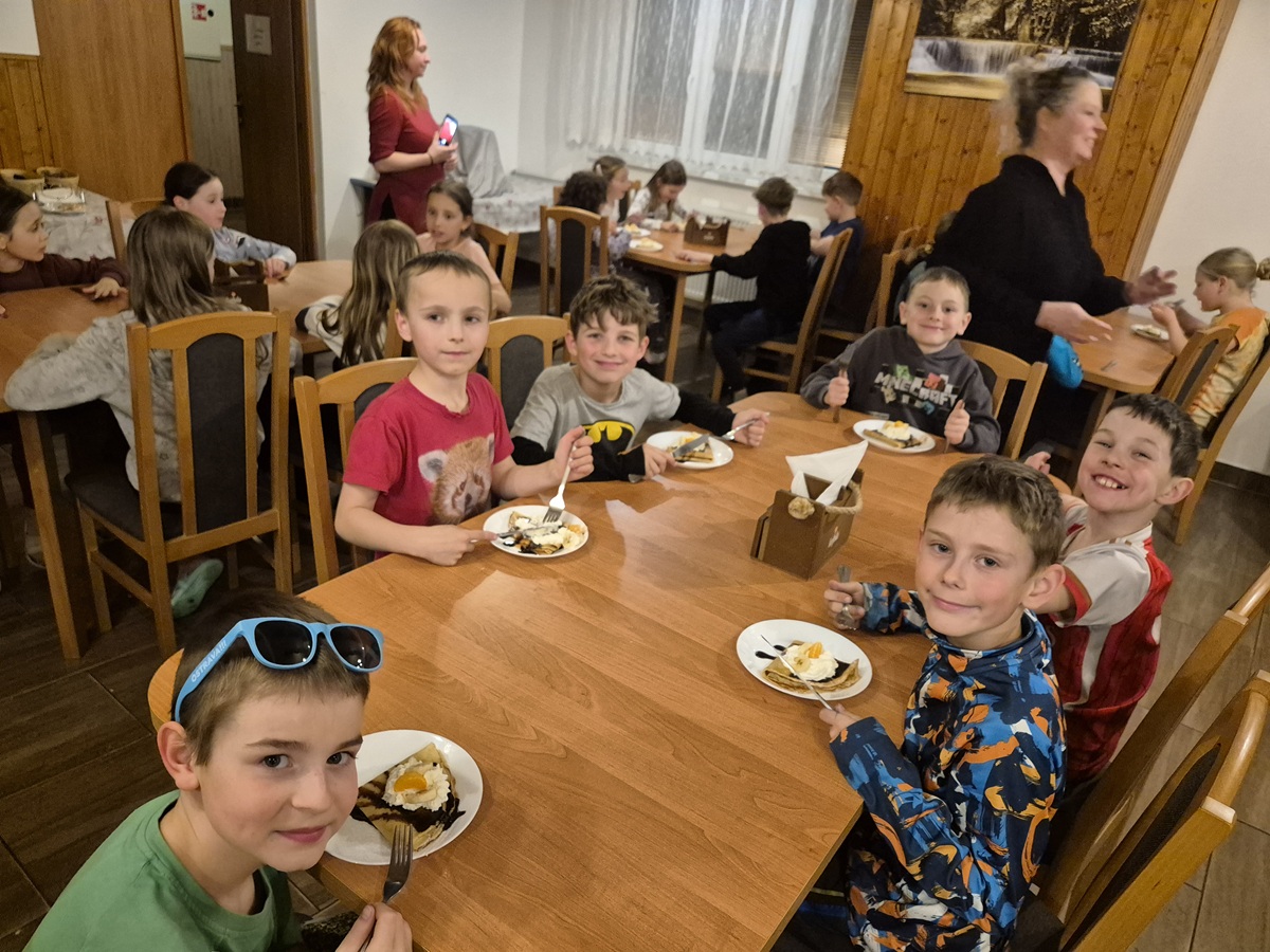 Poslední den nám nasněžilo mokrým sněhem, takže veškerý program byl na chatě. Nejdříve jsme hráli hru „Uhádni, kdo jsi“, pak jsme zhodnotili celý pobyt a aktivity a dočetli knihu Městečko. Následovala hra „Městečko Palermo“, odpoledne bowling a pátrací hra. Večer došlo na to nejočekávanější: vyhodnocení všech soutěží. Všichni si nakonec odnesli krásné ceny a třešničkou na dortu byly palačinky jako druhá večeře. Pokud vás zajímá, kolik bylo lentilek ve sklenici, tak jich tam bylo 280. Nejblíže byli se svým tipem rodiče od Nely z 3. B. 🙂