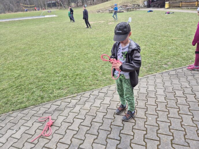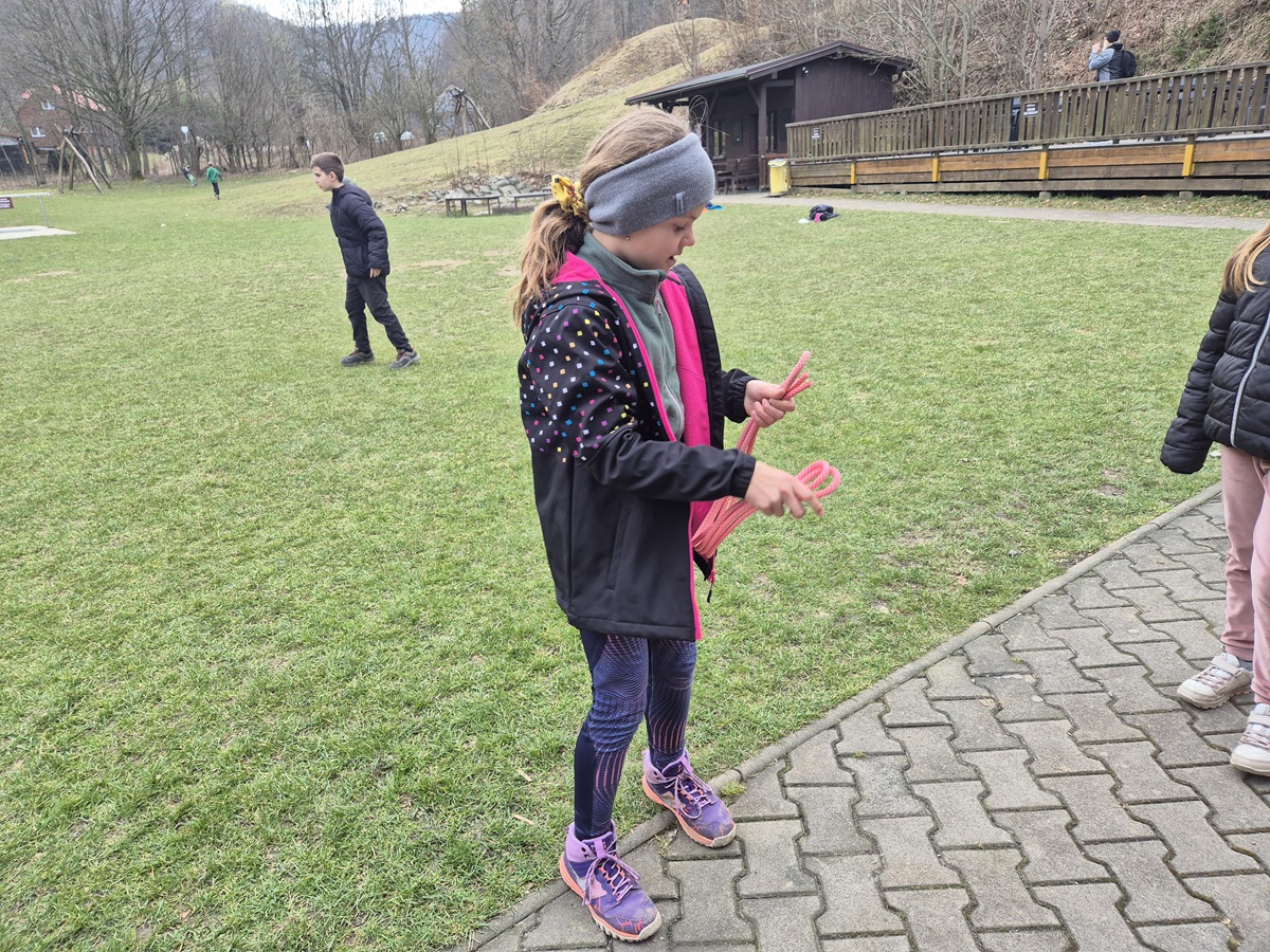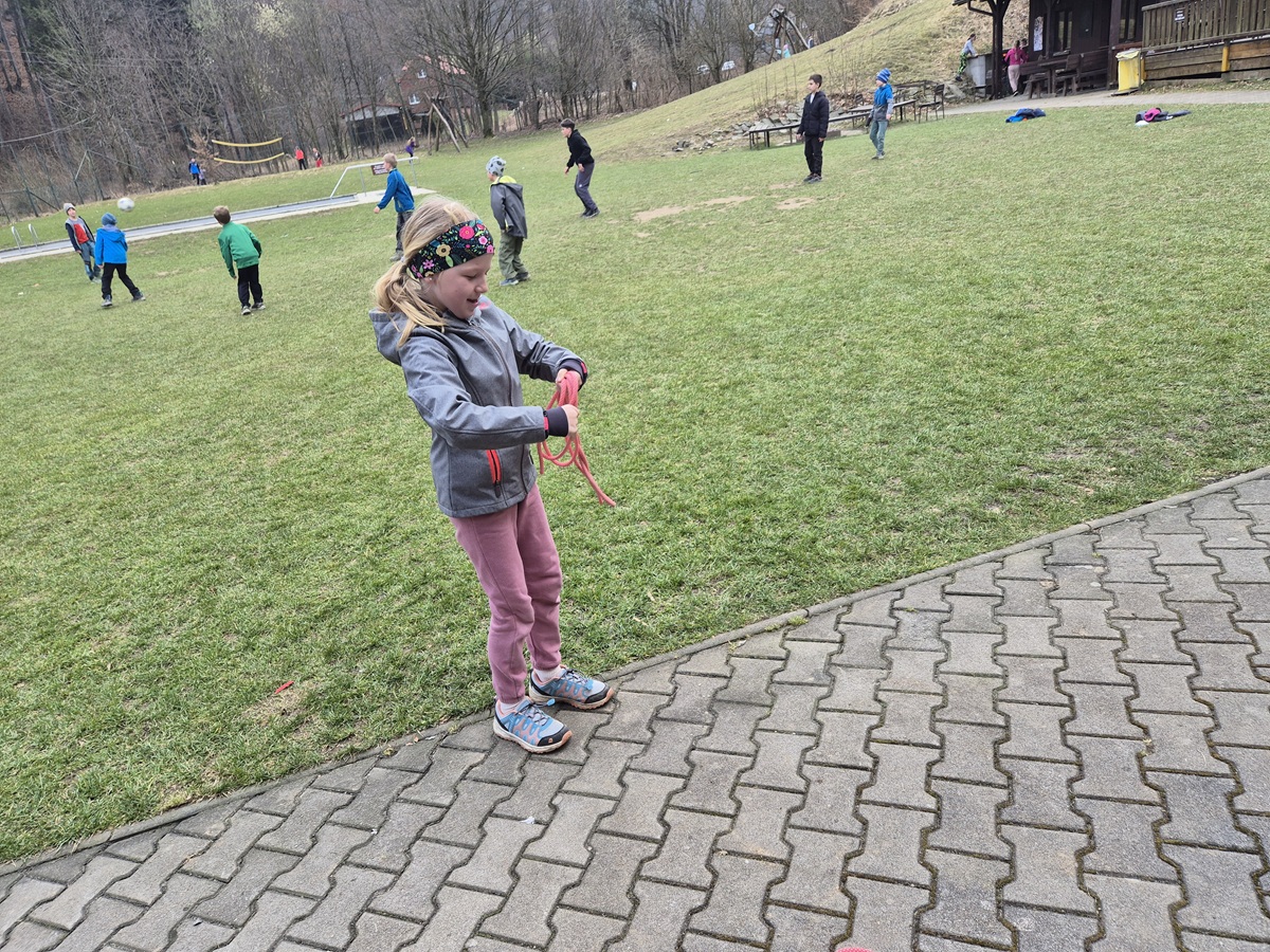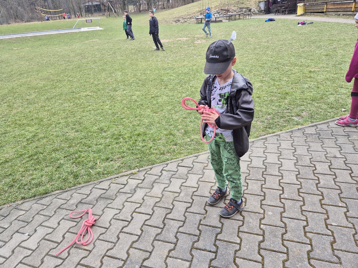 Nedělní dopoledne patřilo válení se, proto bylo vyhlášeno pyžamové dopoledne a dokoukávali jsme film. Pak šly děti řešit Matematického klokana a plnit další disciplínu desetiboje. Museli svázat 3 švihadla do uzlu. Byl to náročný úkol, protože mnoho dětí neumí udělat obyčejný uzel. Přesto máme tři vítězky: Áďu, Niki a Tamču. Odpoledne jsme šli na delší procházku a zahráli hru.