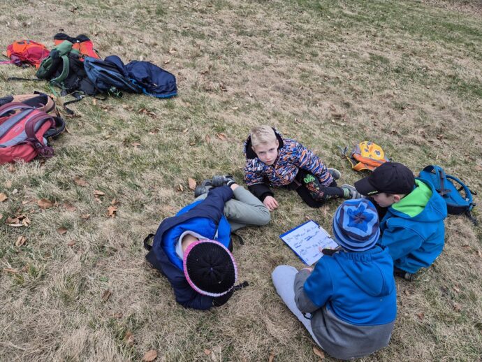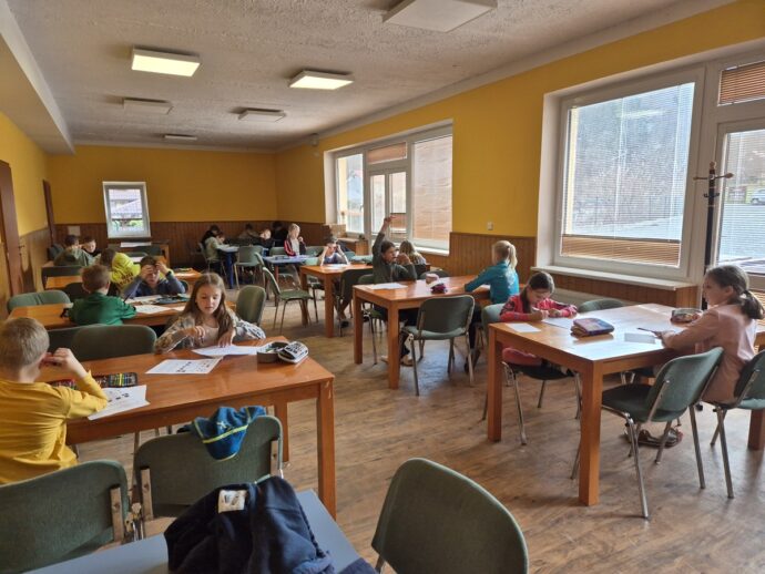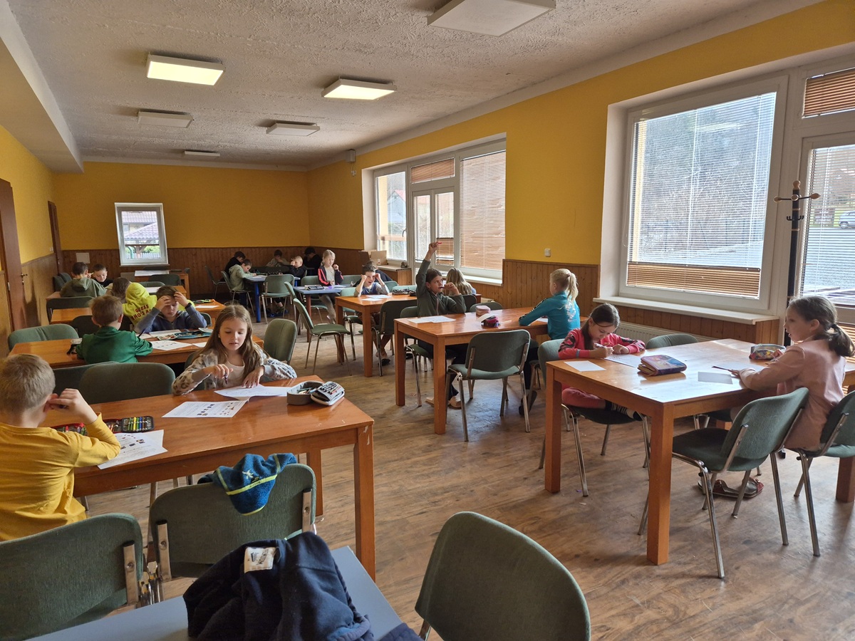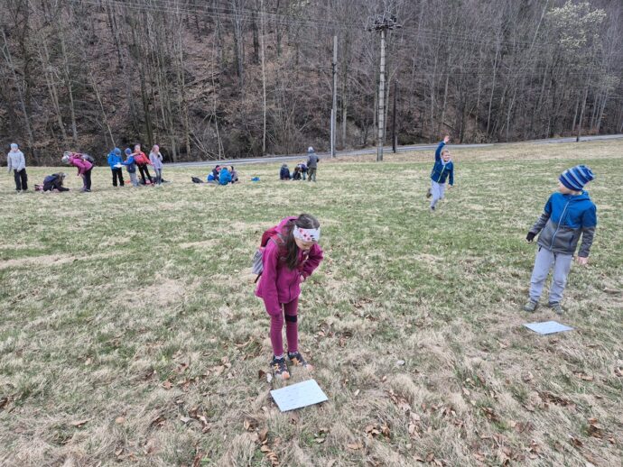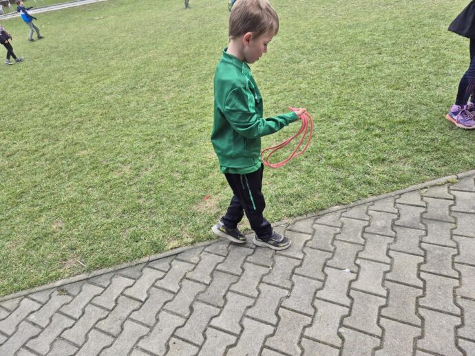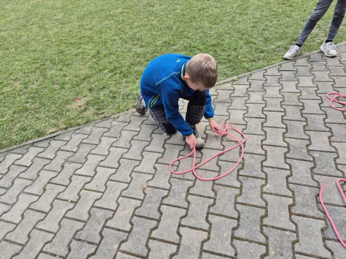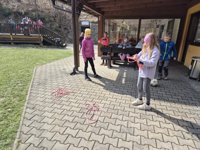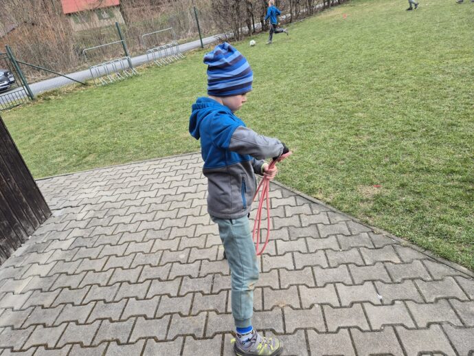 Nedělní dopoledne patřilo válení se, proto bylo vyhlášeno pyžamové dopoledne a dokoukávali jsme film. Pak šly děti řešit Matematického klokana a plnit další disciplínu desetiboje. Museli svázat 3 švihadla do uzlu. Byl to náročný úkol, protože mnoho dětí neumí udělat obyčejný uzel. Přesto máme tři vítězky: Áďu, Niki a Tamču. Odpoledne jsme šli na delší procházku a zahráli hru.
