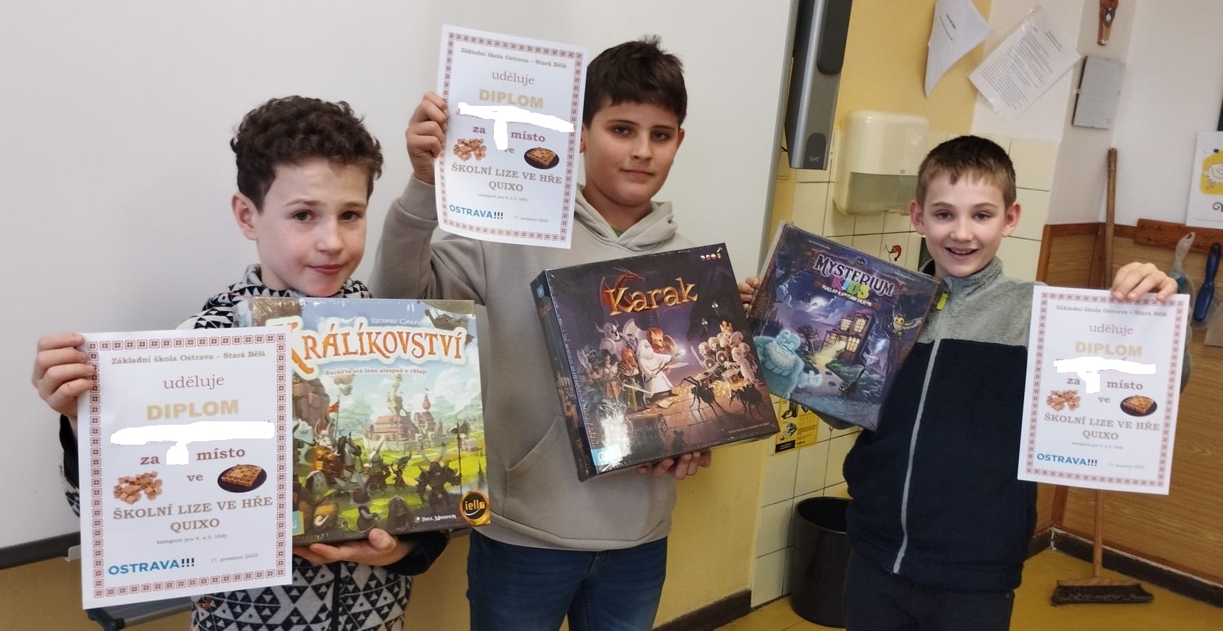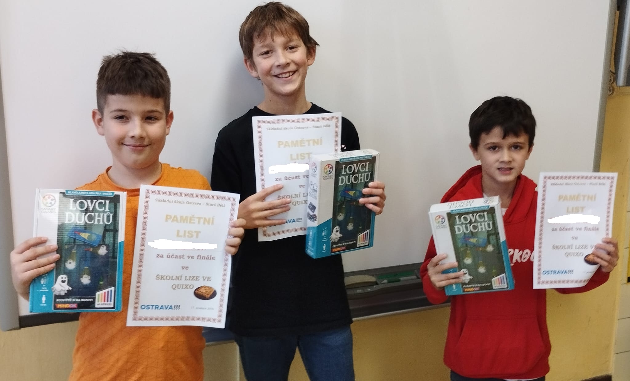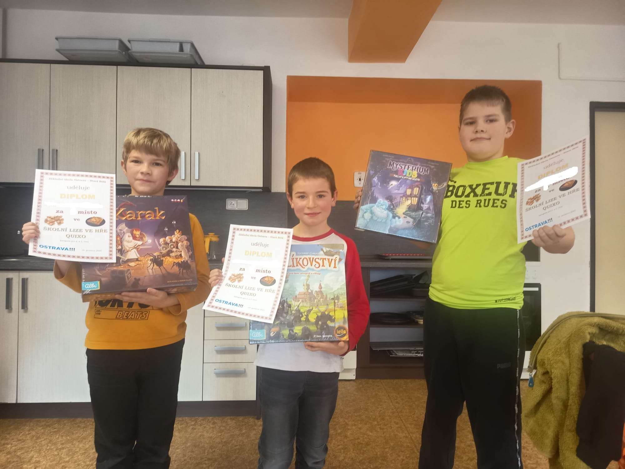 V prosinci probíhá na naší škole tradičně finále školní ligy ve hře QUIXO. V kategorii 2. a 3. tříd se utkali vždy dva nejlepší hráči z každé třídy. Vítězství v letošním roce patřilo Damianovi Stuchlému z 3.A, na druhém místě se umístil Antonín Kozák taktéž z 3.A a třetí pozici obsadil Robert Fuciman z 3.C.