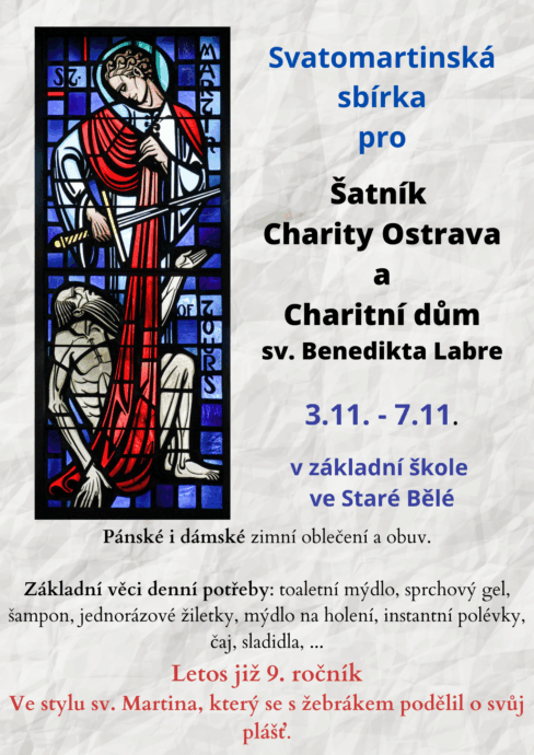 Již 9. rokem pořádáme na naší škole v rámci Svatomartinského průvodu v naší obci sbírku potřeb denní potřeby a zimního šatstva pro Charitní dům sv. Benedikta Labre v Ostravě a pro Šatník Charity Ostrava.