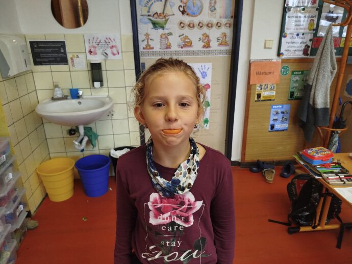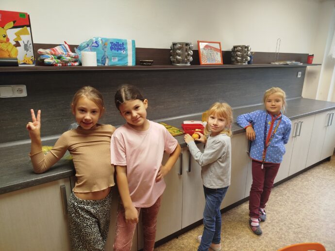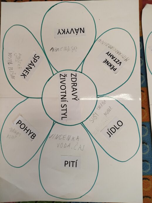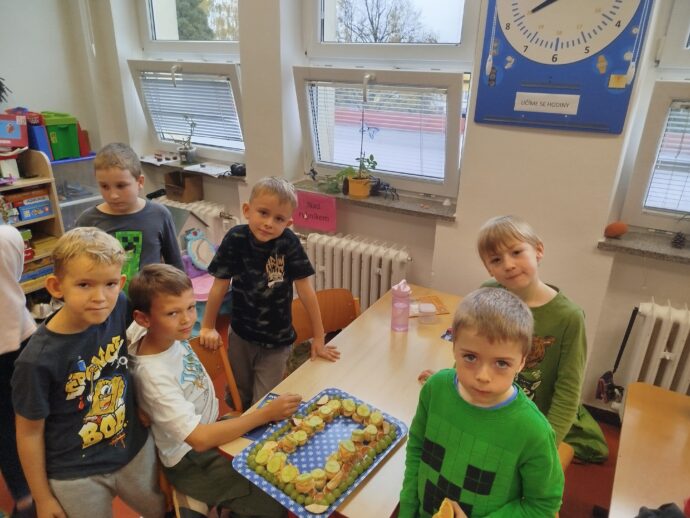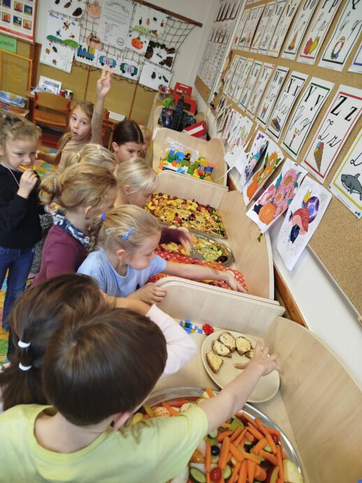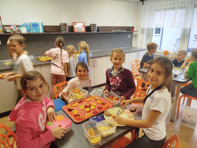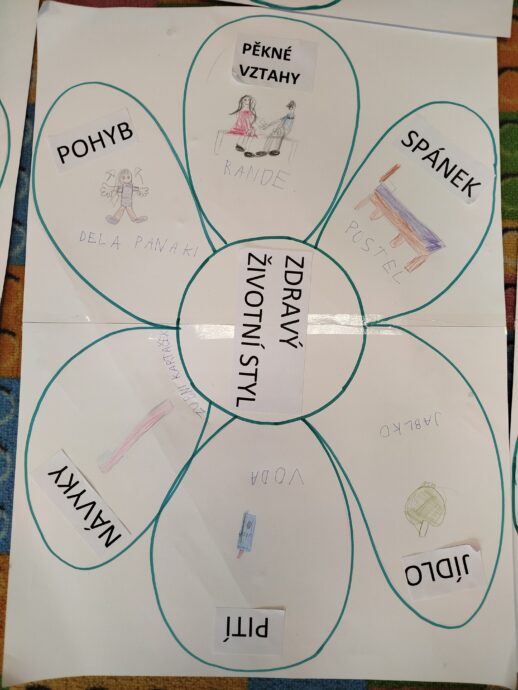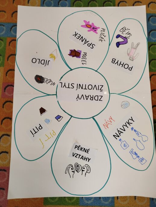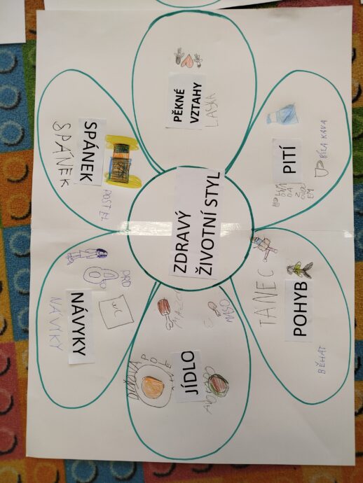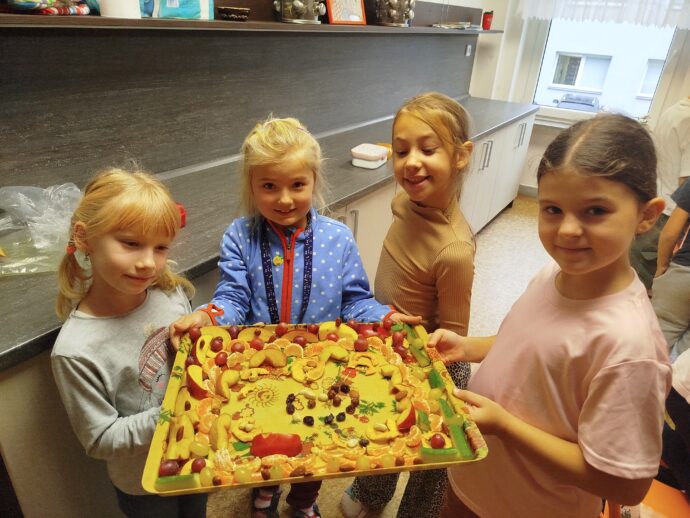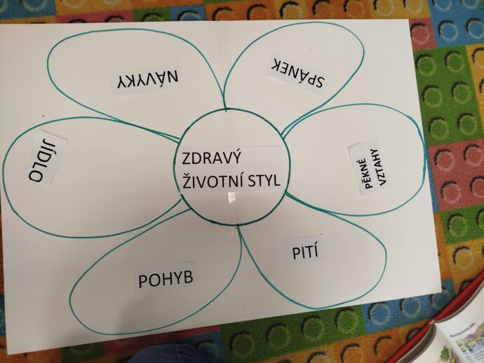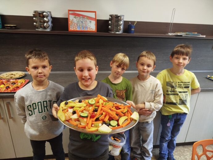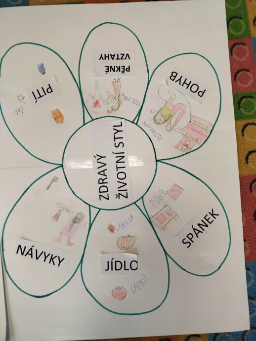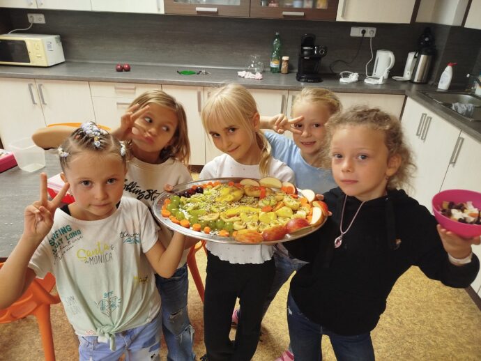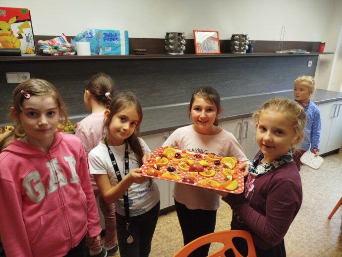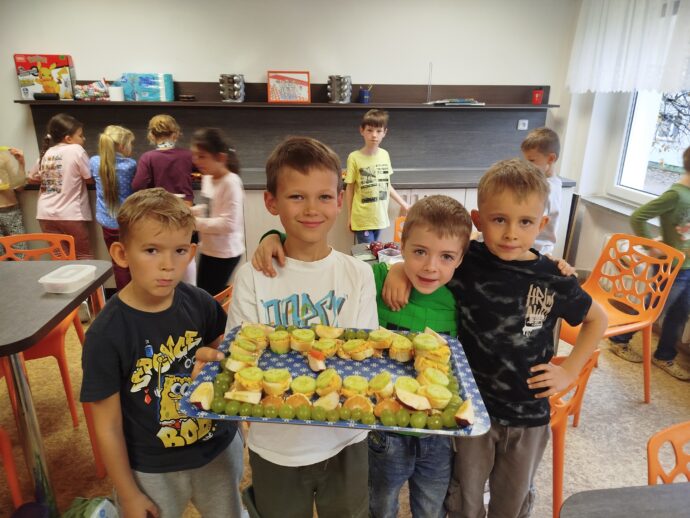 V letošním školním roce jsme se zaměřili na zdravý životní styl. Každý den jsme zpracovávali nějaké téma – jídlo, pití, zdravé návyky, pohyb a pěkné vztahy. Informace děti hledaly v encyklopediích, povídali jsme si či jsme sledovali zábavná videa na www.zdrava5.cz. Děkuji rodičům za suroviny na páteční tvoření v kuchyňce.