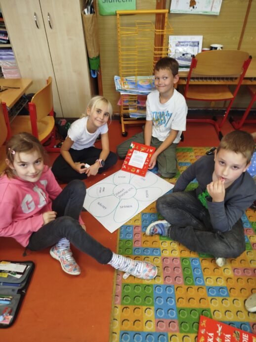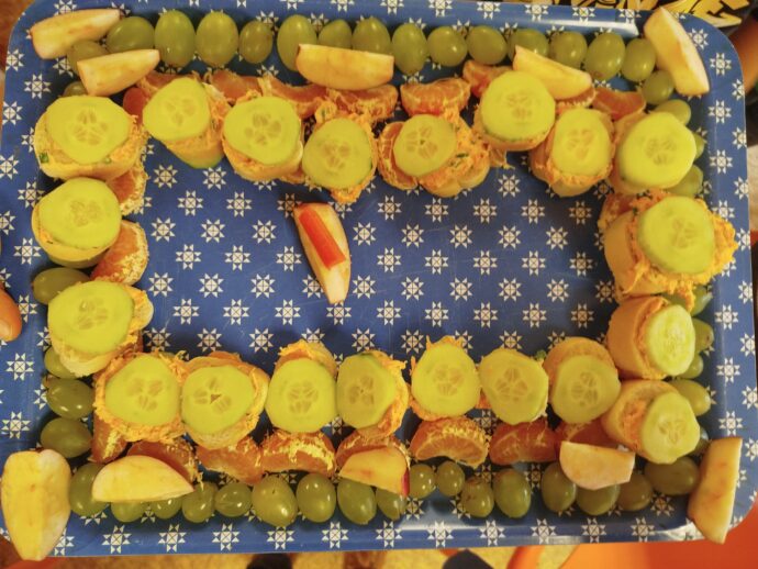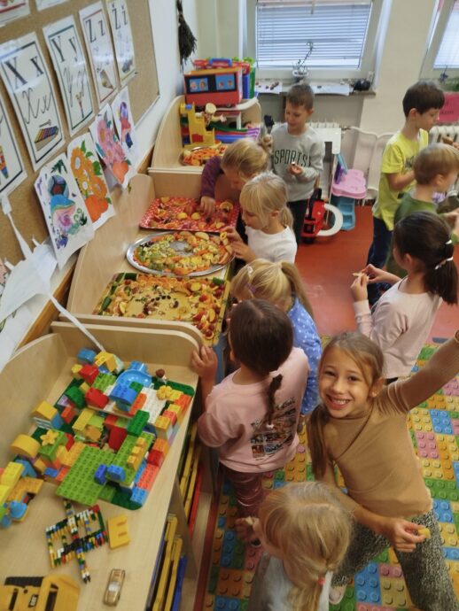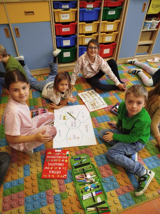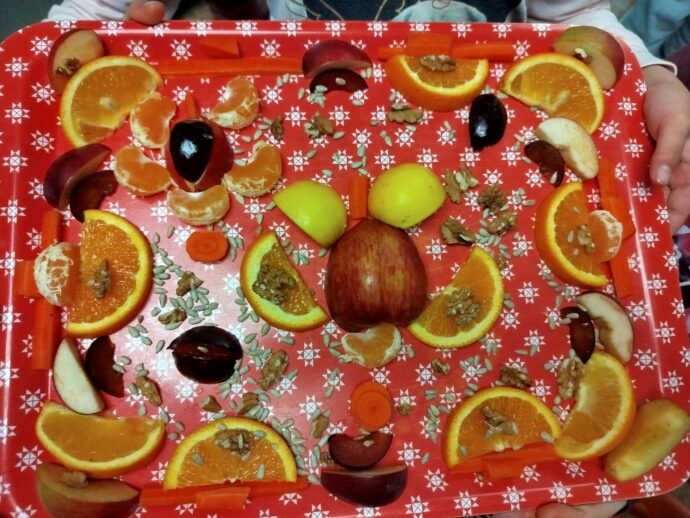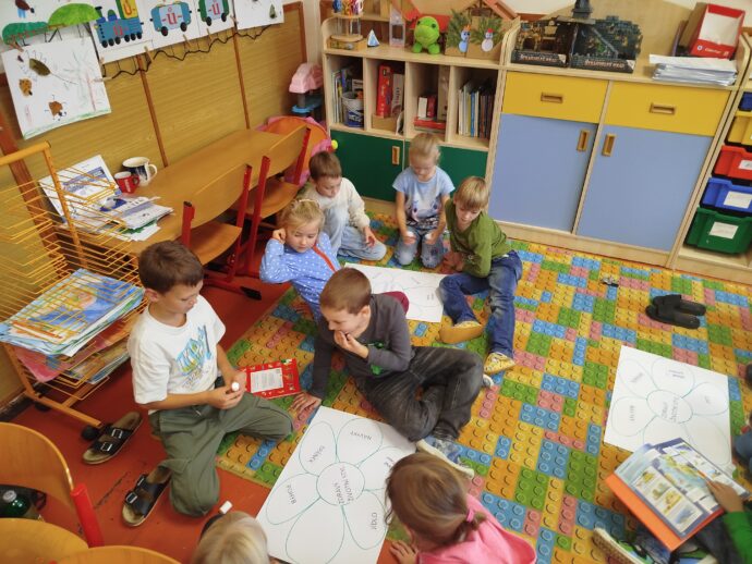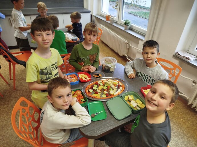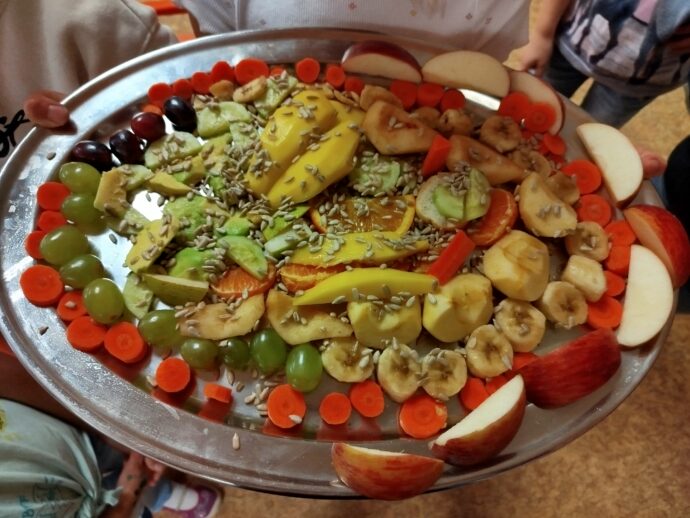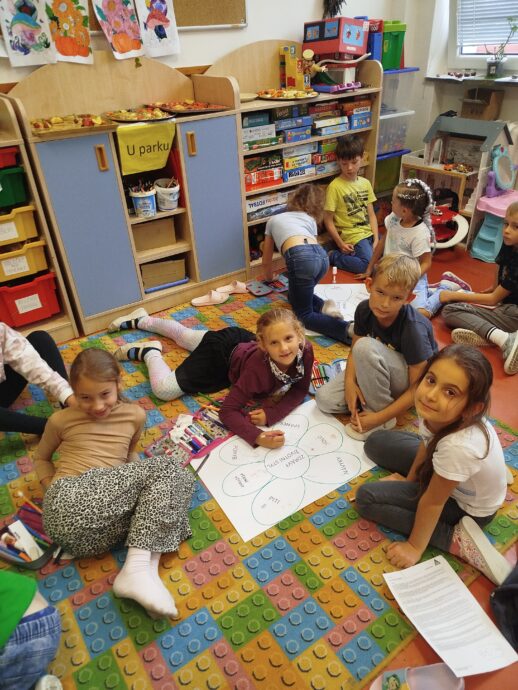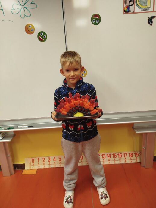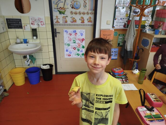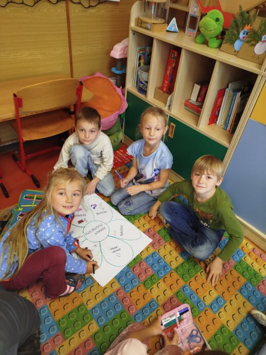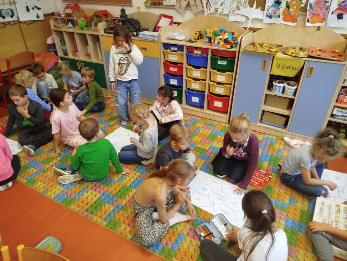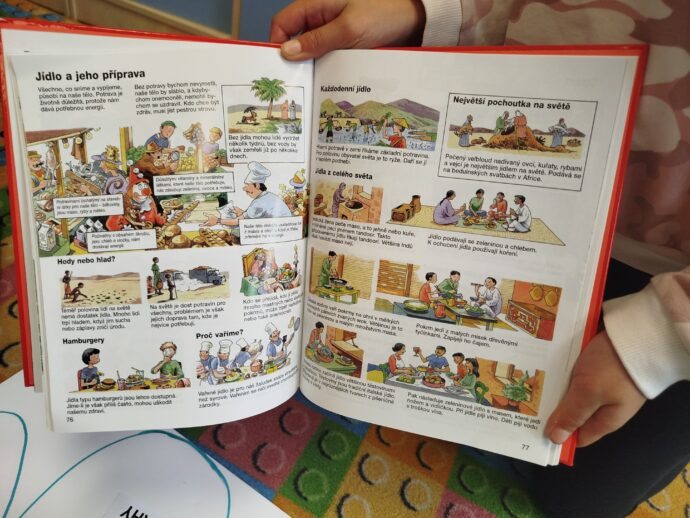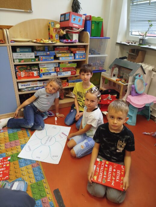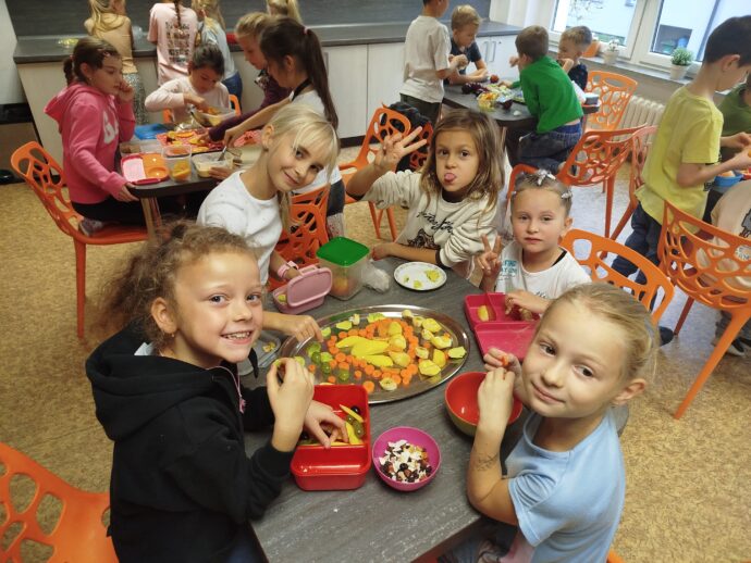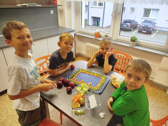 V letošním školním roce jsme se zaměřili na zdravý životní styl. Každý den jsme zpracovávali nějaké téma – jídlo, pití, zdravé návyky, pohyb a pěkné vztahy. Informace děti hledaly v encyklopediích, povídali jsme si či jsme sledovali zábavná videa na www.zdrava5.cz. Děkuji rodičům za suroviny na páteční tvoření v kuchyňce.