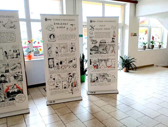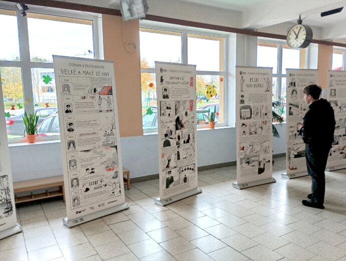 Během měsíce října je na naší škole k vidění výstava Ostrava v Protektorátu, kterou nám zapůjčilo Ostravské muzeum. U příležitosti 80. výročí konce 2. světové války se na osmi panelech žáci mohou seznámit trochu netradičně s regionální historií. Prostřednictvím autentických příběhů zpracovaných ve formě kresleného komiksu výstava přibližuje události druhé světové války z perspektivy tehdejších obyvatel města. Dotýká se především problematiky hrdinství a morálních hodnot. Proto jsou ke každému panelu připojeny dvě otázky nebo úvahy k zamyšlení. Naši žáci nejen v hodinách dějepisu vypracovávali pracovní listy a zamýšleli se nad řadou otázek spojených s touto tematikou.